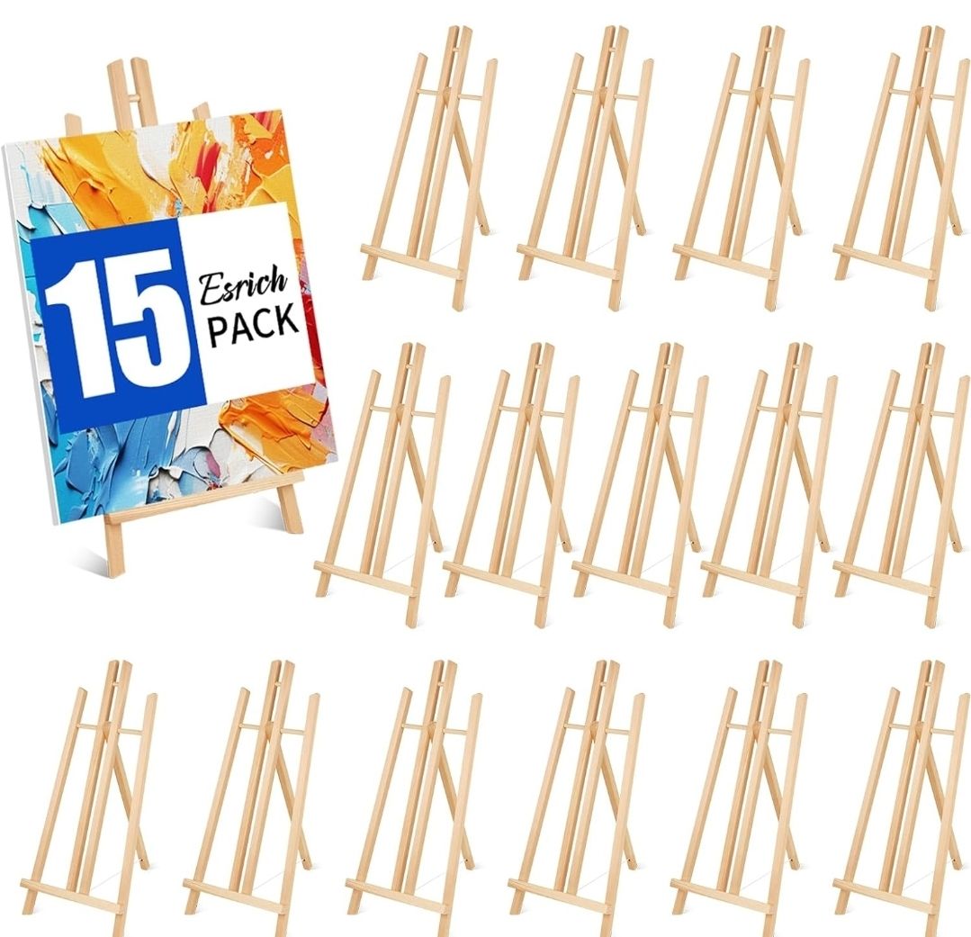 ESRICH 15pcs 17 Inch Tabletop Easels, Easel Stand for Painting,Tripod, Paint Party Easel, Kids Student Desktop Easel for Painting,Paint Easel for Canvas 【Product Introduction】: Our art easel is made of sturdy pine wood, unpainted, environmentally friendly material, and has a smooth surface. Durable and sturdy, without the need for assembly, the bottom tray with groove design can well accommodate canvas and wooden boards. The rear tripod is fixed by a rope, which can adjust the required angle of the easel and maintain its balance, making it less likely to fall off