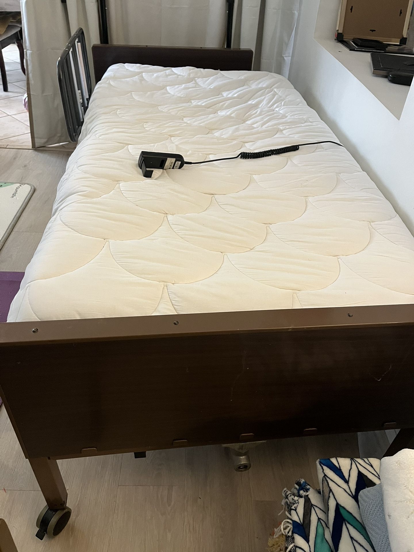 6-way electric bed very quiet motor. 2 Side rails can be taken off. Comfortable foam mattress.