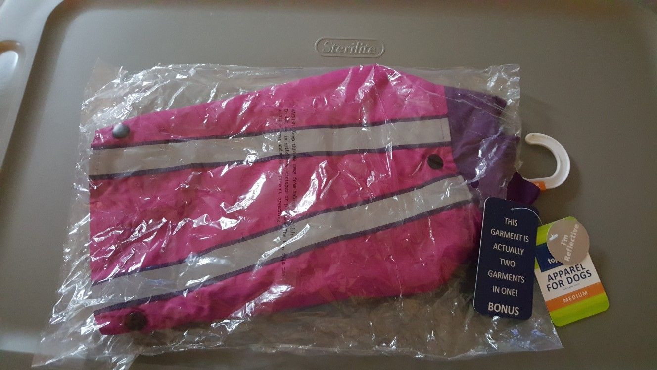 Size medium. 2 garments in 1. Outer jacket has reflective stripes for safety. Inner fleece sweater is removable and can be worn together or separate. Super cute. Still in the packaging. Sold new for $30.