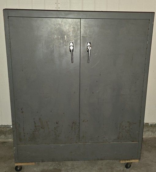 Metal Garage Cabinet ($200) Approximate dimensions: 3 feet wide X 41 inches tall X 18 inches deep It's doesn't have wheels on it, that's just something of mine I set it on to roll it around. It sits flat on the floor. I don't have the key for it. Local Pickup Only (Lenexa, KS)
