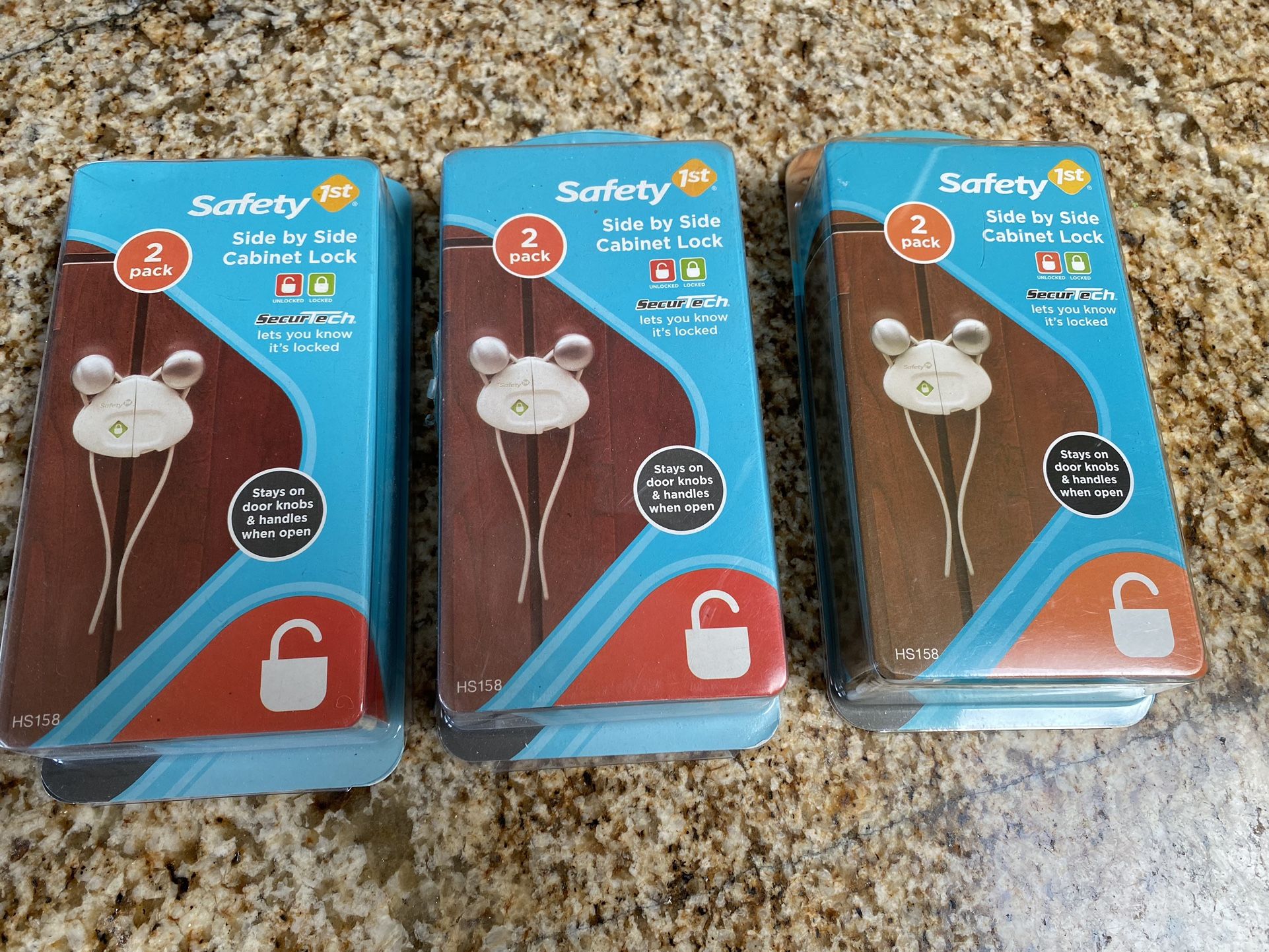 New in box, 3 pairs of Safety First side-by-side cabinet locks; great for preventing curious little ones from getting into cabinets! We bought extra and never ended up using them. One pack of two retails for $6.99 at Target.