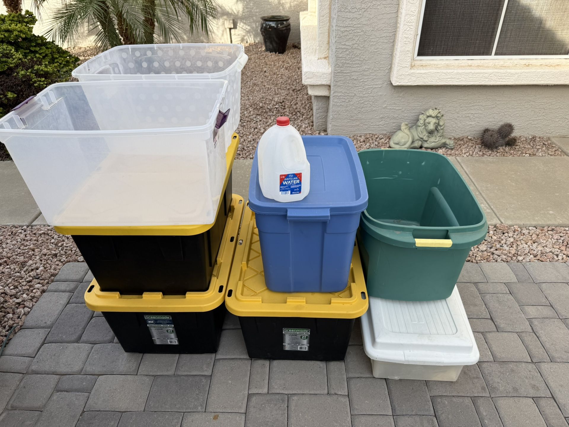 Selling all of these storage bins for $20!!! That’s right, all of them for 20 bones. One of the big yellow lids has a crack in it. 3 others do not have lids. All for $20. Located in Goodyear near the Cal Ranch store. Thanks for looking.