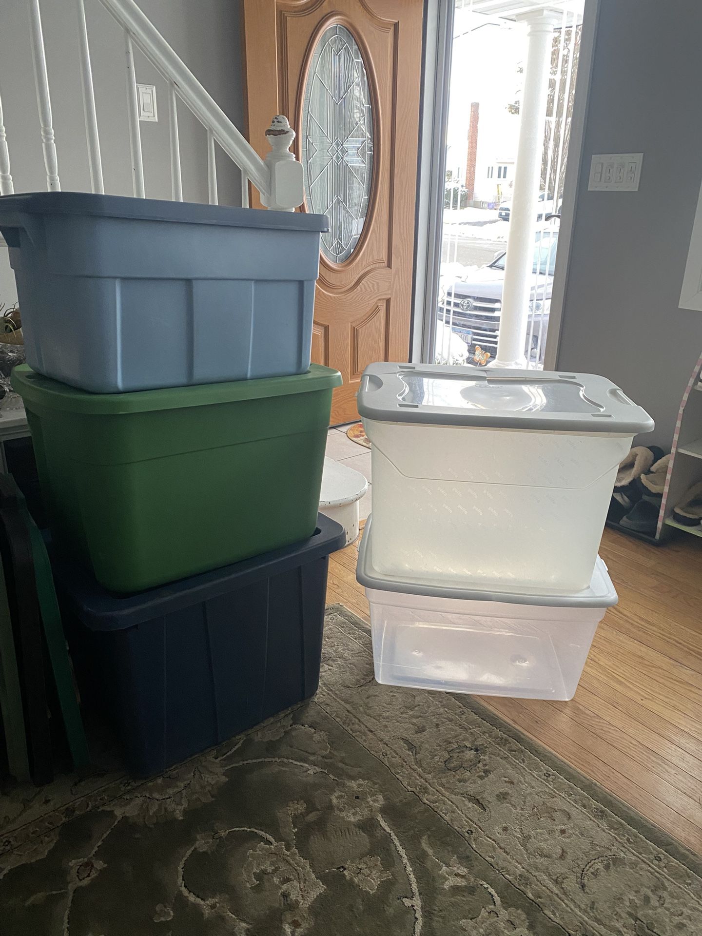 Lids on the right side on the white ones are not exact fit and have some damage Blue container has blue container has small hole Priced to sell