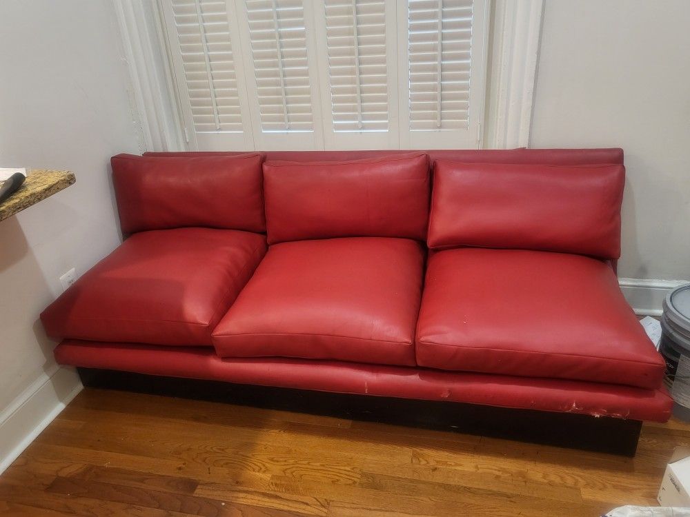 This item will be included in an estate sale on 8/24. Price negotiable. Look at the pictures to understand the quality. Thus is a vintage sofa from the 80s. This is a super easy to clean, functional, comfortable sofa. Ideal for a waiting room like a hair salon. It can easily be broken down for transport as the base and cushions can be removed. The bottom cushions are clipped in, so they won't fall off the sofa. Quality ventilation holes are upholstered into the cushions, so they compress with weight.