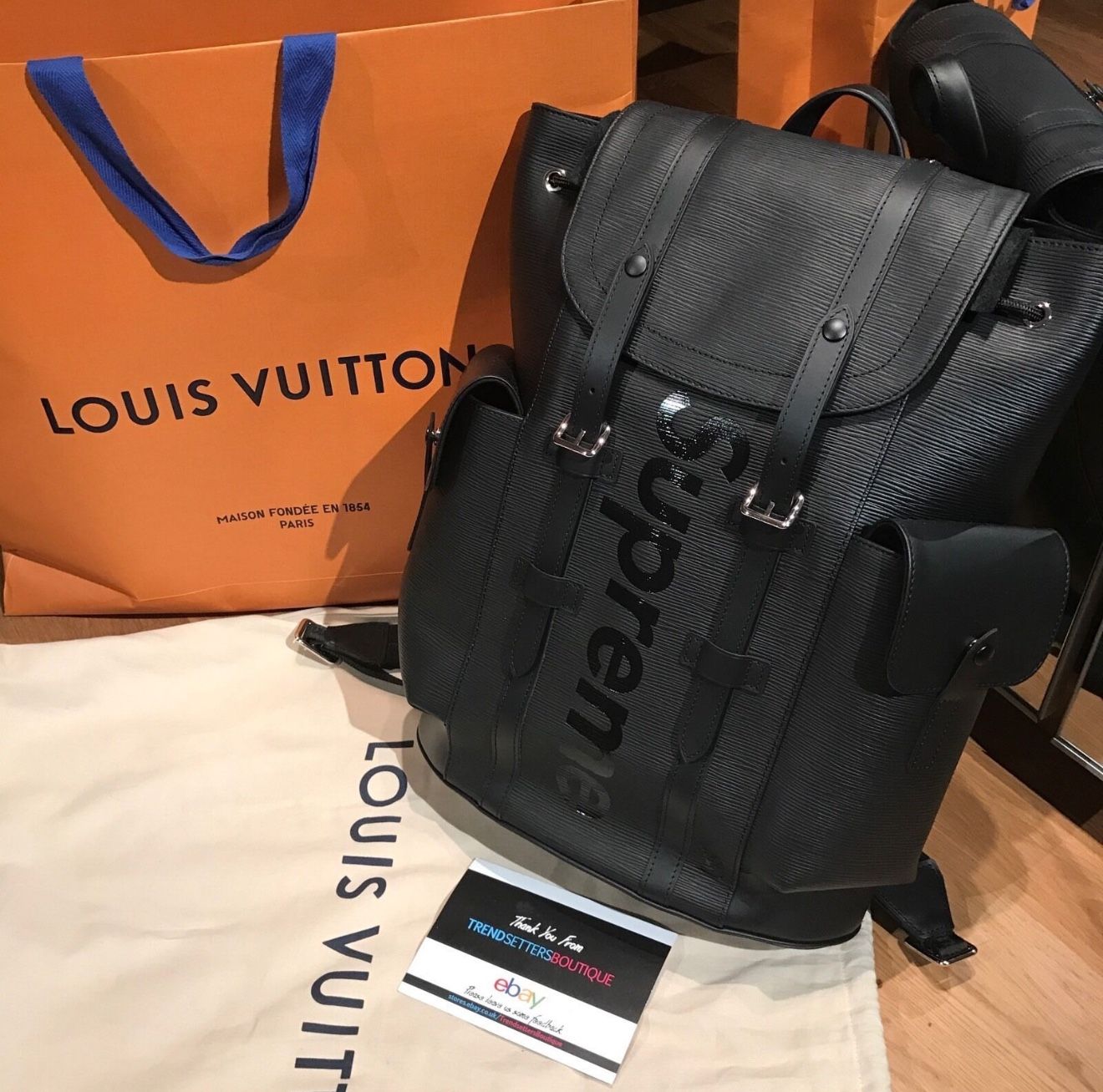 The Louis Vuitton x Supreme Backpack in black Epi leather is a hallmark of the 2017 collaboration between the French luxury fashion house and the American streetwear brand. This partnership seamlessly blends Louis Vuitton’s heritage craftsmanship with Supreme’s urban aesthetic, resulting in a highly coveted accessory. Materials and Design: • Epi Leather: Introduced by Louis Vuitton in 1985, Epi leather is renowned for its durability and distinctive textured appearance. The black variant provides a sleek, understated backdrop for the bold branding. • Branding: The backpack prominently features a glossy black “Supreme” logo in Futura Heavy Oblique font, emblazoned across the front, juxtaposing the classic Louis Vuitton monogram subtly integrated into the design. • Hardware: Silver-tone hardware accents, including buckles and zippers, complement the monochromatic theme, adding a touch of elegance. Functionality and Features: • Storage: The backpack offers a spacious interior with multiple pockets, including two exterior side pockets with snap closures and interior flat pockets, providing ample space for daily essentials. • Dimensions: Approximately 16.1 inches in height, 12 inches in width, and 5.1 inches in depth, making it suitable for both everyday use and travel. • Closure: A flap with two buckles and a drawstring closure ensures the security of belongings while maintaining a stylish appearance. Pricing and Availability: Upon its release in 2017, the Christopher Backpack retailed for approximately $3,900. Due to its limited production and high demand, the backpack’s value has appreciated on the resale market, with prices ranging between $12,000 and $14,000, depending on condition and provenance. Target Audience: This backpack appeals to fashion enthusiasts who appreciate the fusion of luxury and streetwear. Collectors of limited-edition pieces and fans of both brands are particularly drawn to this collaboration, valuing its exclusivity and cultural significance. Brand Ambassadors and Cultural Impact: While specific ambassadors were not officially designated for this collaboration, the Louis Vuitton x Supreme collection garnered significant attention from celebrities and influencers, amplifying its desirability. The partnership marked a pivotal moment in fashion, bridging the gap between high-end luxury and streetwear, and setting a precedent for future collaborations in the industry. The Louis Vuitton x Supreme Christopher Backpack in black Epi leather stands as a testament to innovative design and cross-cultural collaboration, appealing to a discerning audience that values both luxury and contemporary street fashion.