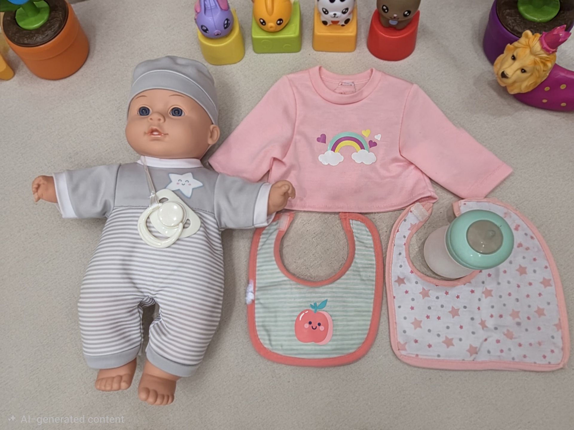 Cute baby doll set with bottle, bib, and pacifier. Clean and gently used. Great for pretend play and nurturing play. All items shown in the photos are included