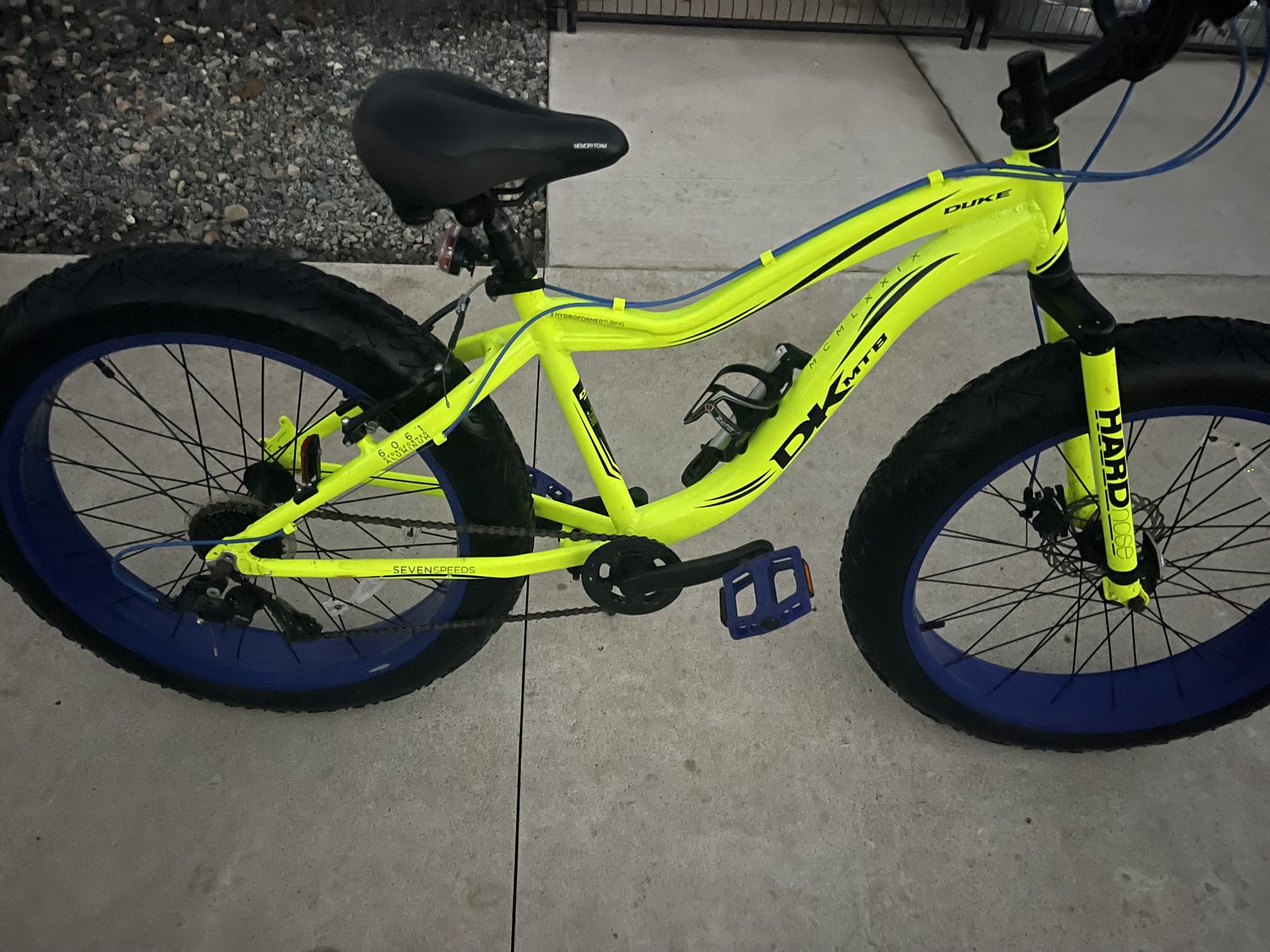Neon green with blue rims, 7 speeds, fat tires, smooth ride. Great condition, everything works perfectly. Perfect for cruising, trails, or city riding.