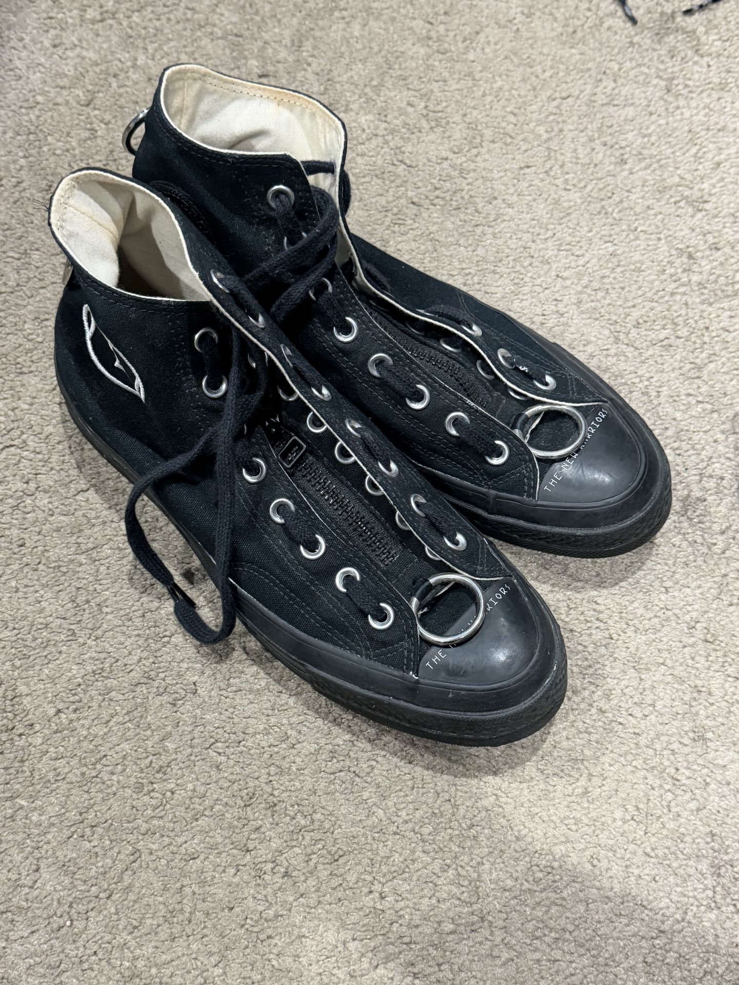 #japanese This Converse Chuck 70 High sneaker is a collaboration with Japanese designer, Jun Takahashi, and his streetwear label, Undercover. Taking inspiration from Walter Hill’s 1979 film, The Warriors, this iteration accents its canvas upper with oversized midfoot zippers and metal ring ornaments on the vamp and heel counter. An embroidered ‘NW’ patch is stitched on the lateral ankle, and ‘The New Warriors’ is written across the rubber toe cap. These are high top sneakers.