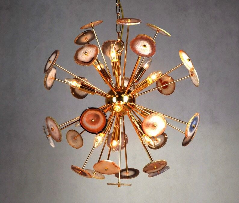 Iron plating gold metal, light body. The modern chrome pendant light is ideal for dinning room, bedroom, bar, living room, hallway, office or restaurant. Is new on box. Dimensions 24”W x 24”H x 12Lights