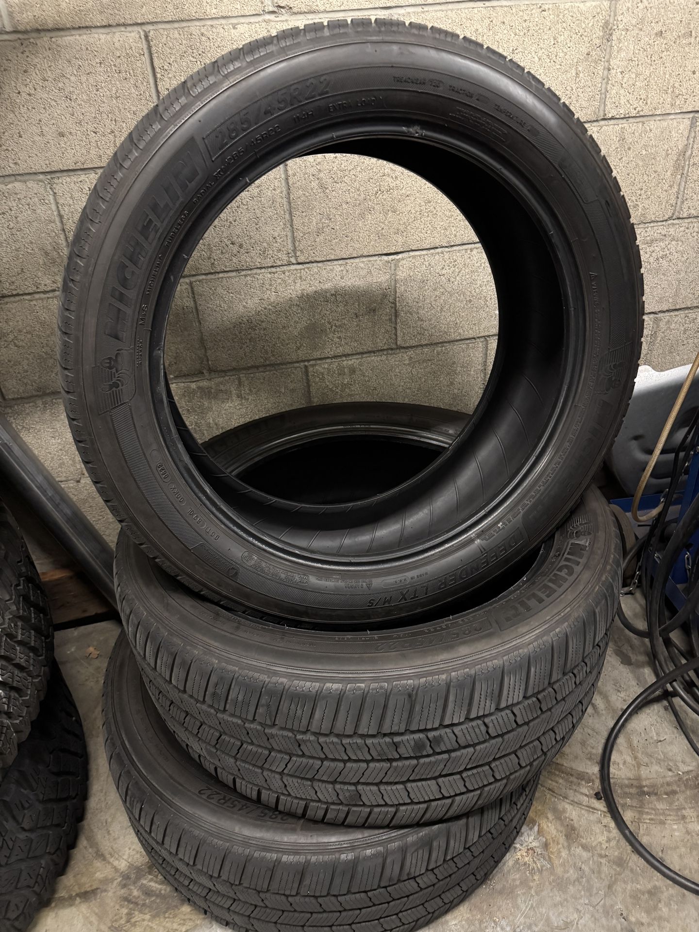 285/45R22 Michelin defender ltx m+s These tires still have more than half tread life No plugs or patches. Willing to split up set