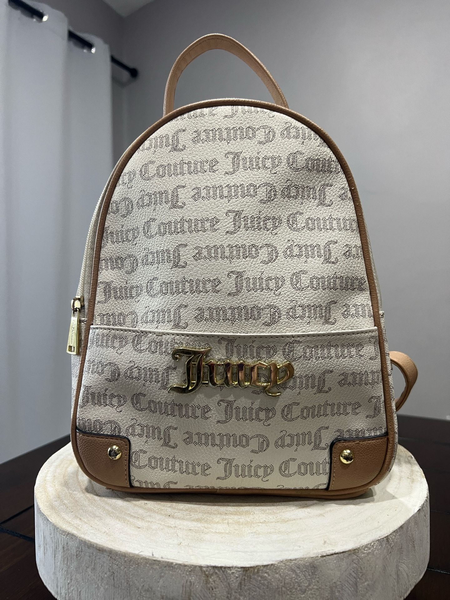 Juicy Couture Rosie Mini Backpack White Sandstone Logo Gold Hardware Y2K VTG. Pre-Owned but in great condition. Please take a look at the pictures and ask any questions you may have before purchasing. Thank you. The Juicy Couture Rosie Mini Backpack in White Sandstone with Gold Hardware is a stylish and trendy accessory perfect for women looking to add a touch of Y2K flair to their outfit. Made from faux leather, this mini backpack features a lined interior and a unique logo pattern that embodies the iconic Juicy Couture style. The brown handle/strap and gold hardware add a touch of luxury to the cream exterior, making it a versatile piece that can elevate any look. Ideal for carrying essentials while out and about, this backpack is a must-have for fashion-forward individuals.