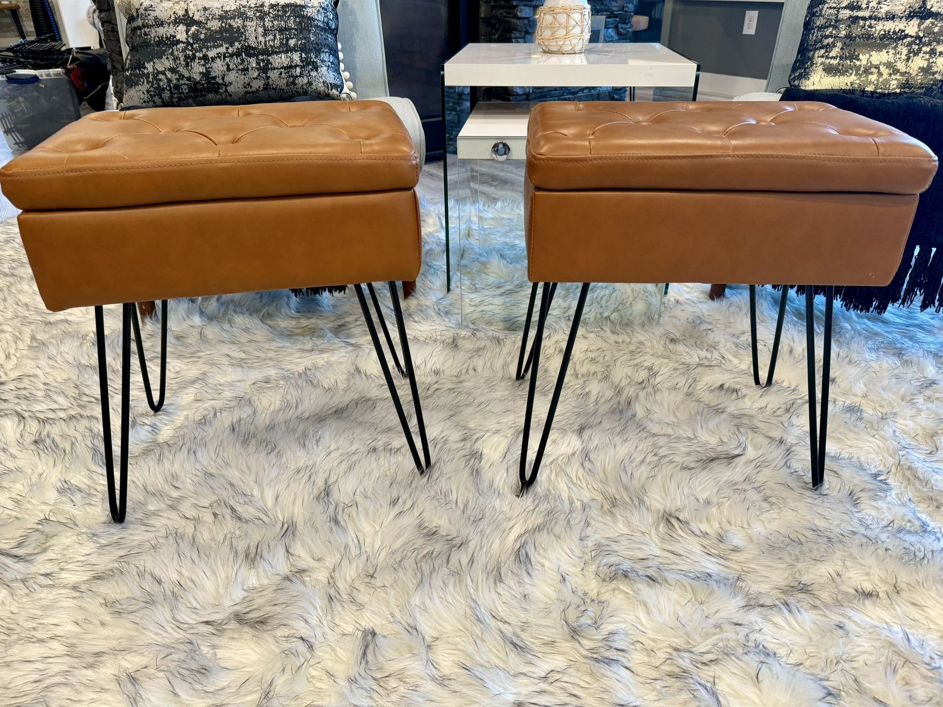 2 - Brown Faux Leather Foot Stools With Black Metal Hair Pin Legs These are brand new and have only been used for staging once. They have storage in each one of them.