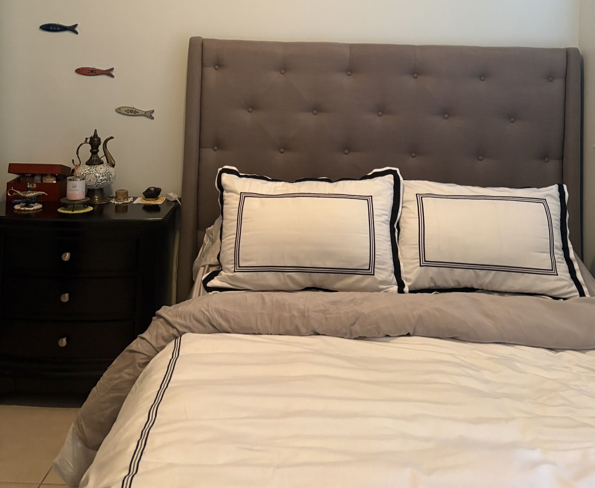 Includes: 1) Gray upholstered Queen bed (headboard & frame set) 1) Memory foam Queen mattress (some aging oxidation stains) 1) adjustable bed frame with remote control for head elevation 1) large nightstand with 3 drawers 1) Lingerie armoire with jewelry storage top and mirror Clean household No smoke PICK UP ONLY DELIVERY NOT AVAILABL
