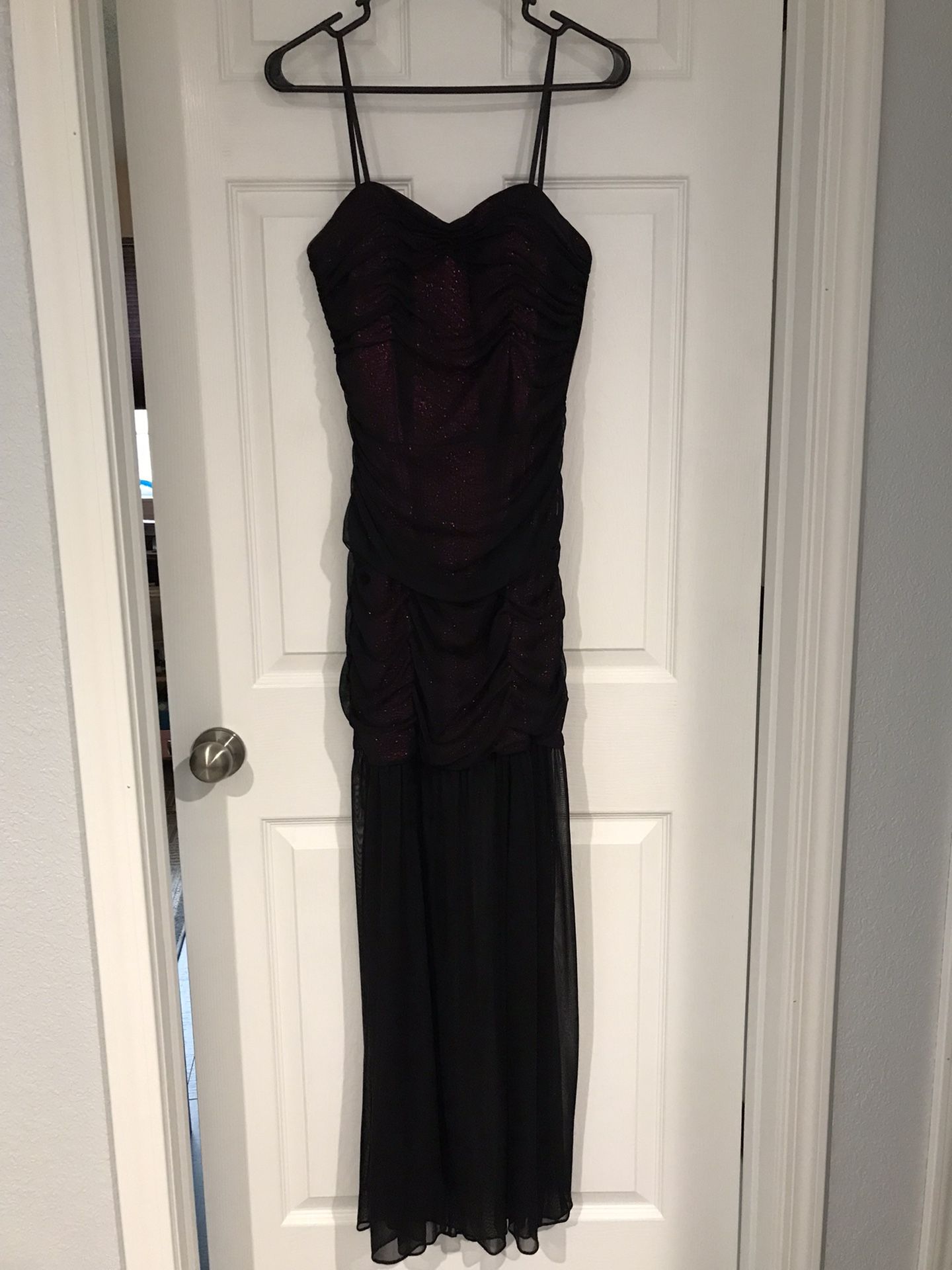 Full length formal gown. Size 9, black color. Top is a magenta color underneath the black for a really pretty color contrast. The bottom half of dress is sheer black.