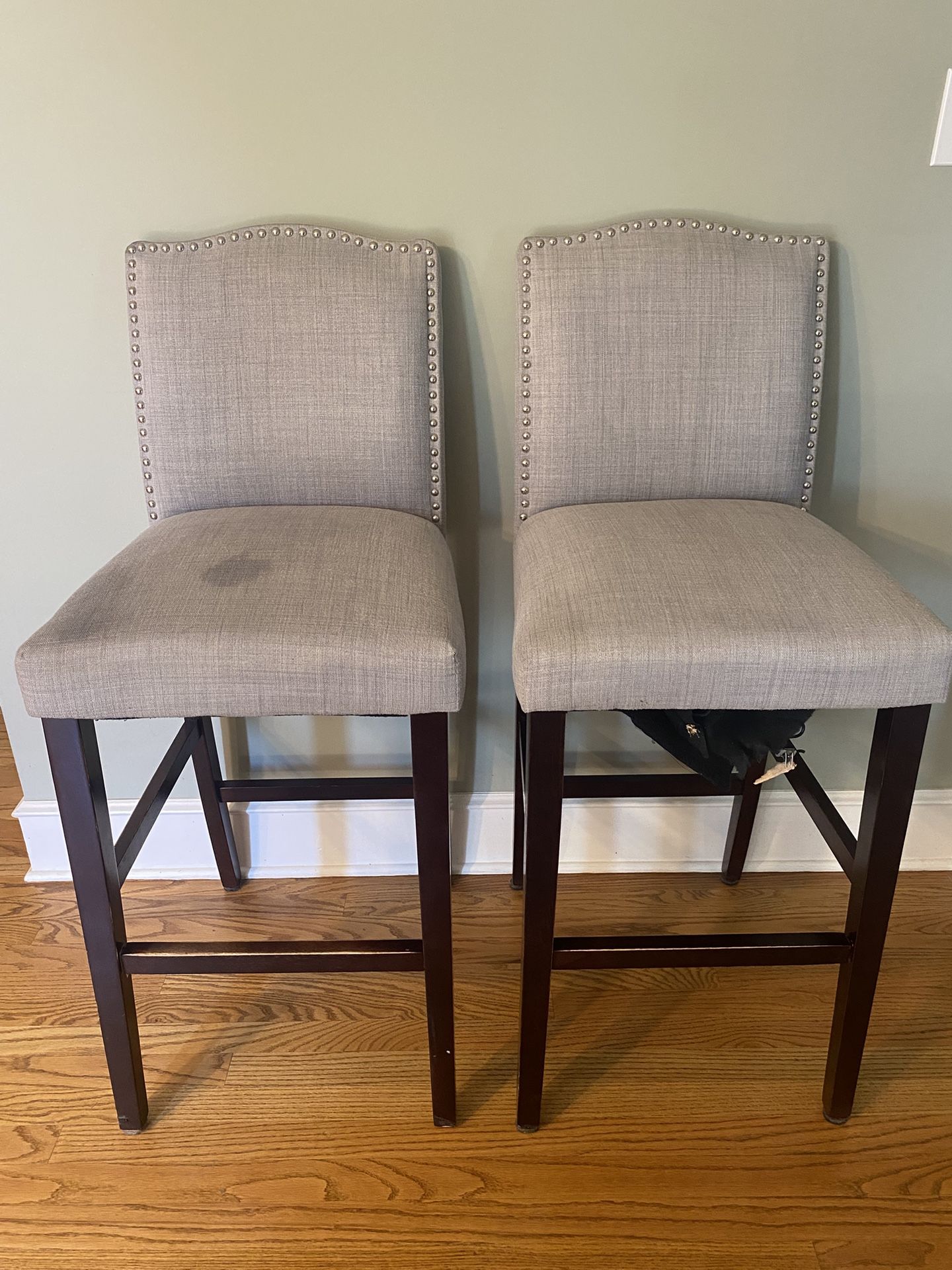 The bottom part of the seat is broken on the right stool, but other than that they are fine. No stains, just stain remover drying from cleaning them. No holds. Pu Belton.