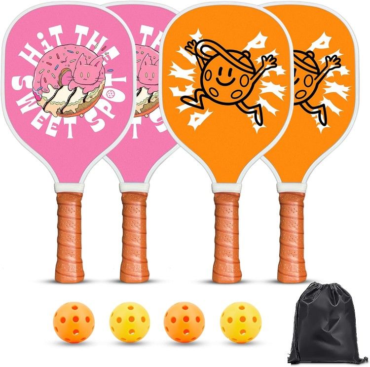 【Premium Quality】Our pickleball paddles set of 4 is crafted from high-quality wood, ensuring enhanced durability and performance. They meet the standards of the USA Pickleball Association, making them perfect for both casual play and official tournaments. 【Lightweight & Easy to Handle】Designed with beginners in mind, our paddles are lightweight and feature comfortable grips, making them easy to handle and perfect for new players. 【Complete Pickleball Kit】Our all-in-one set includes 4 pairs of paddles, 4 high-performance balls, and a stylish carrying bag, providing everything you need to start your pickleball journey. 【Unique & Attractive Design】Stand out on the pickleball court with our uniquely designed paddles, perfect for boys and girls. Plus, our set makes an excellent gift for birthdays, holidays, or any special occasion.