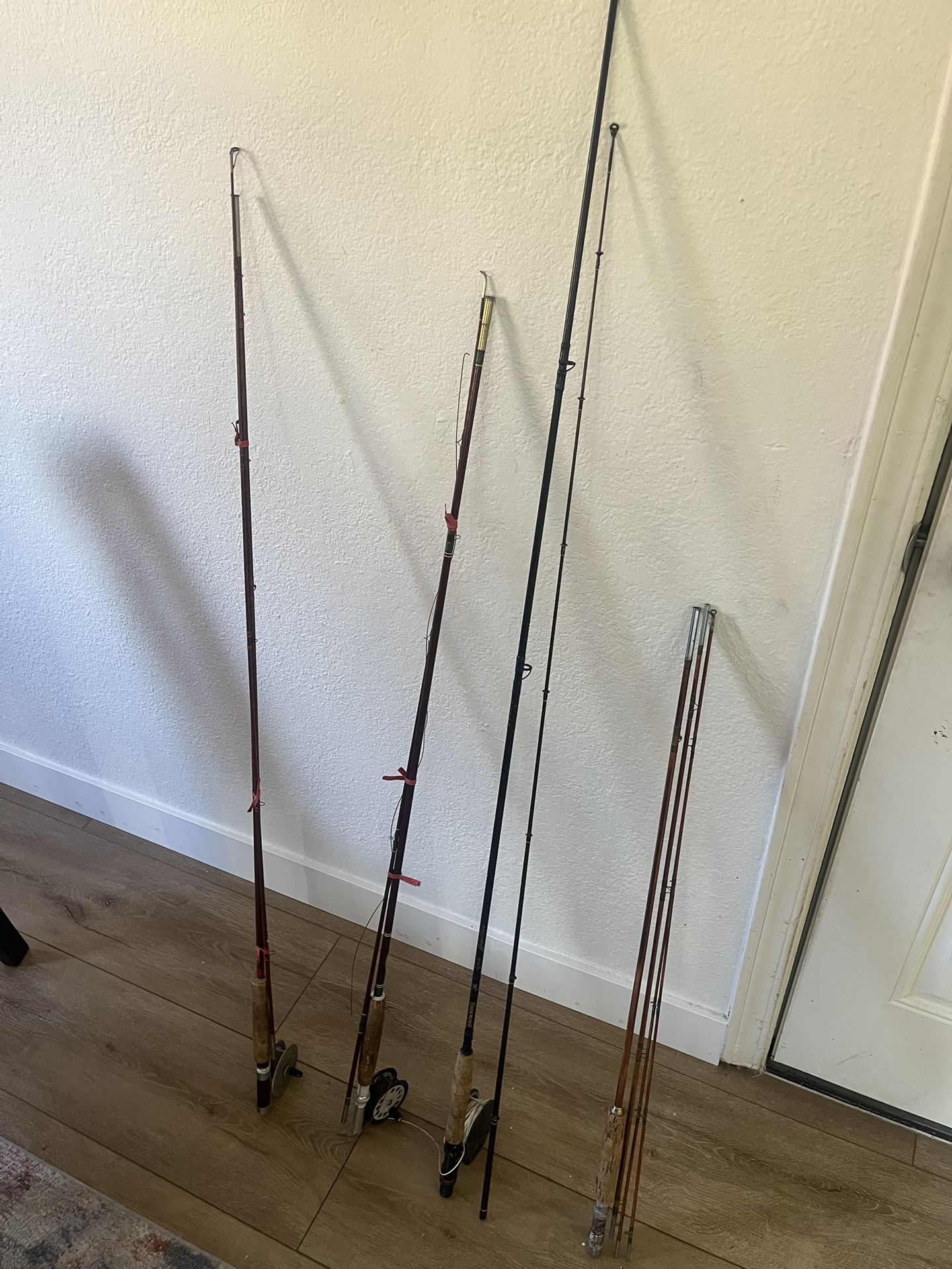 Four fly rods, three reels, three of them are very old but in good shape, one is more modern. Selling all for $100.00
