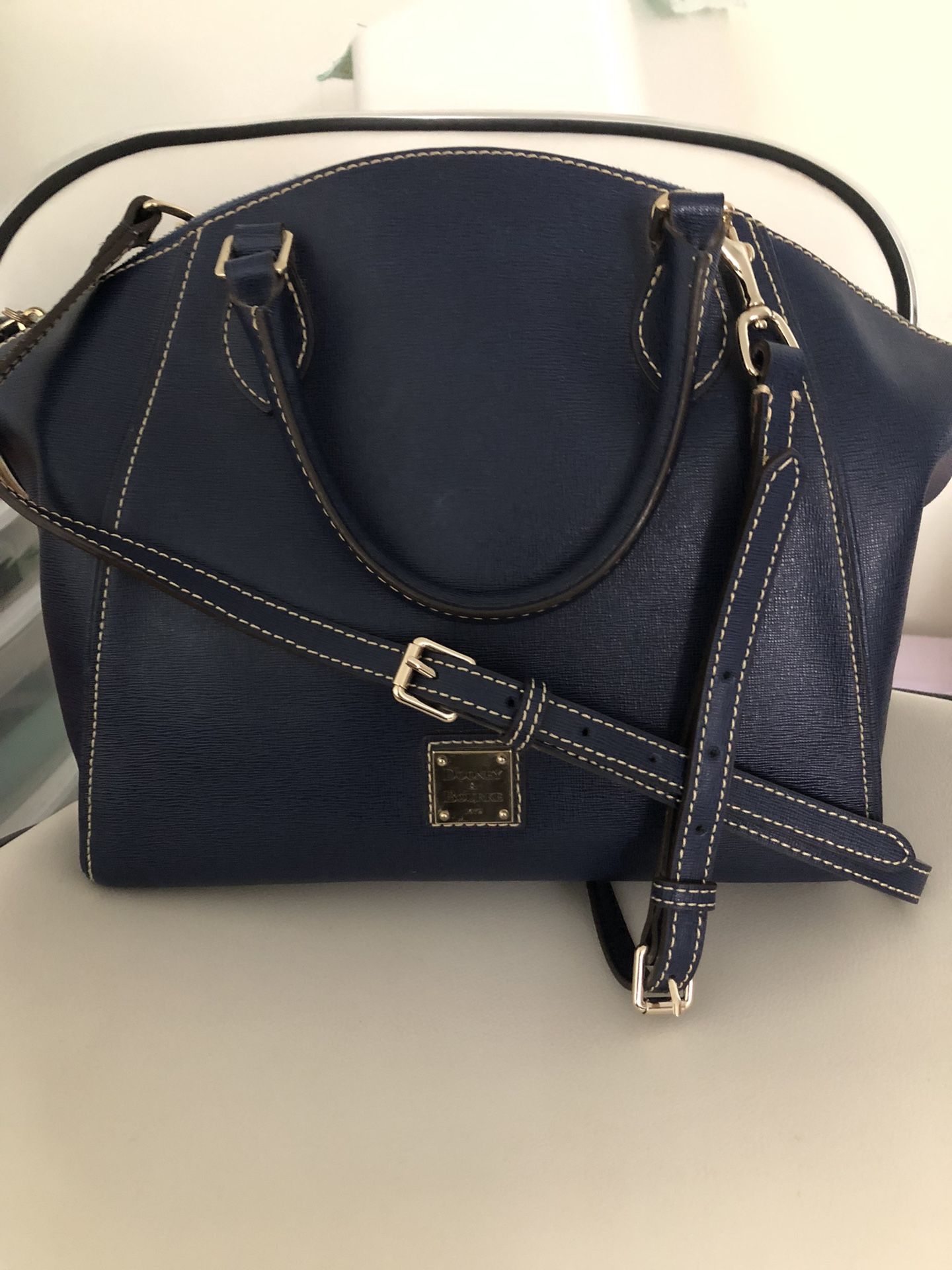 Dooney & Bourke , Navy blue leather handbag. L- 11”x W 6” H 10”. Lightly used. Plenty of space and great condition. Price- $175 OBO.