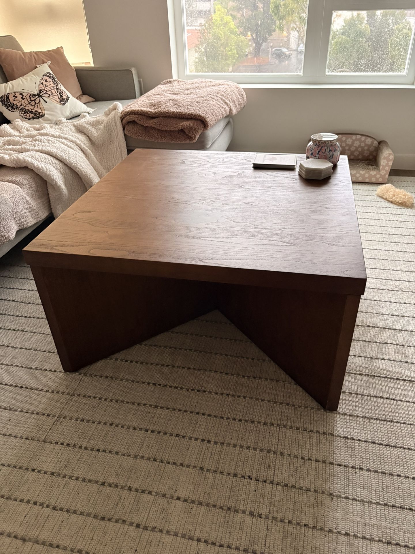 Pretty walnut coffee table from target’s studio mcgee collection. Good condition. 18 Inches (H) x 34 Inches (W) x 34 Inches (D) Purchased for $300. It would require two people to move as it is a bit heavy. I am in an apartment building so I would recommend a cart or multiple people to move.