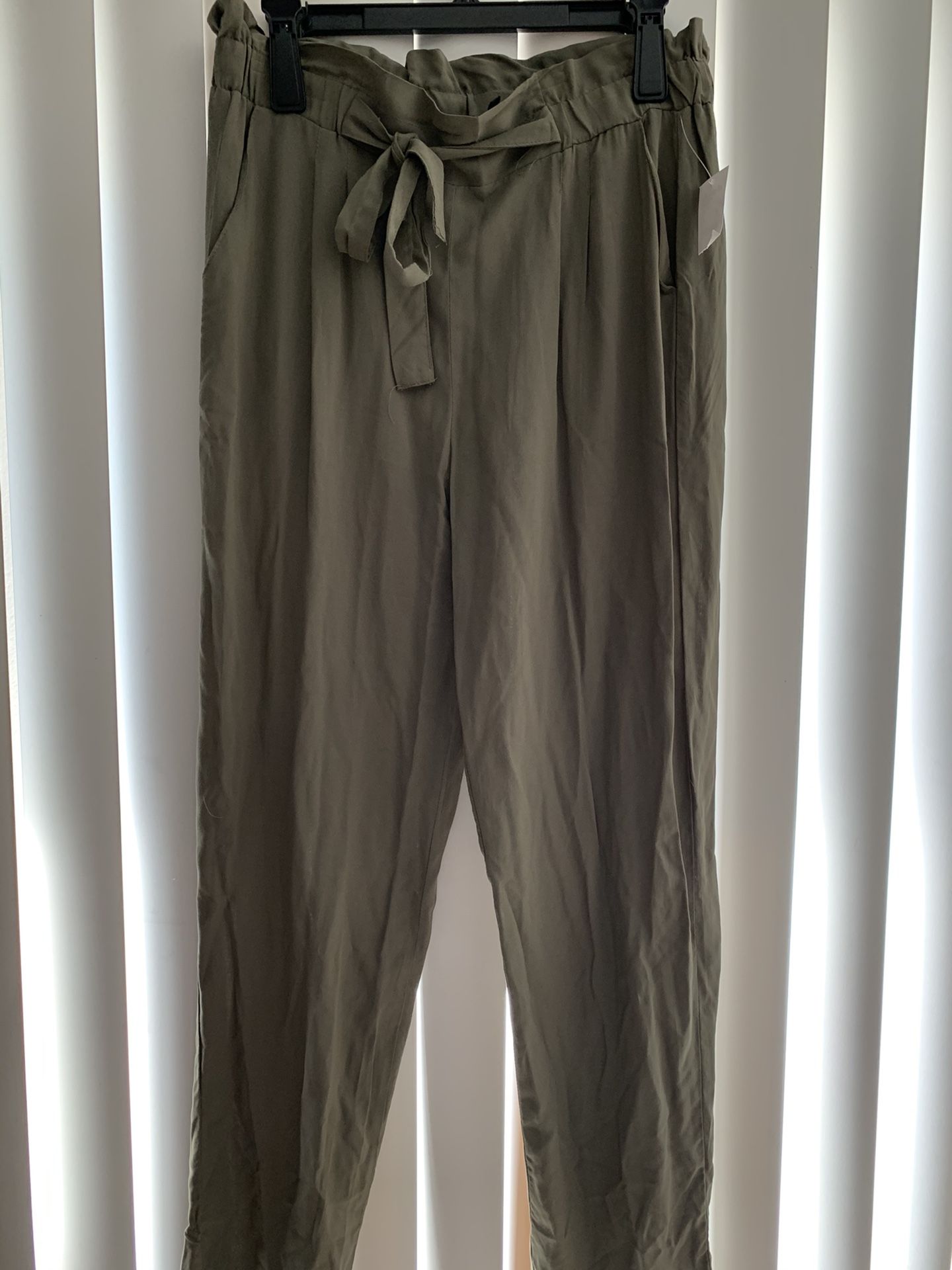 Green pants with belt and pockets, size large, never worn. Brand new with tags