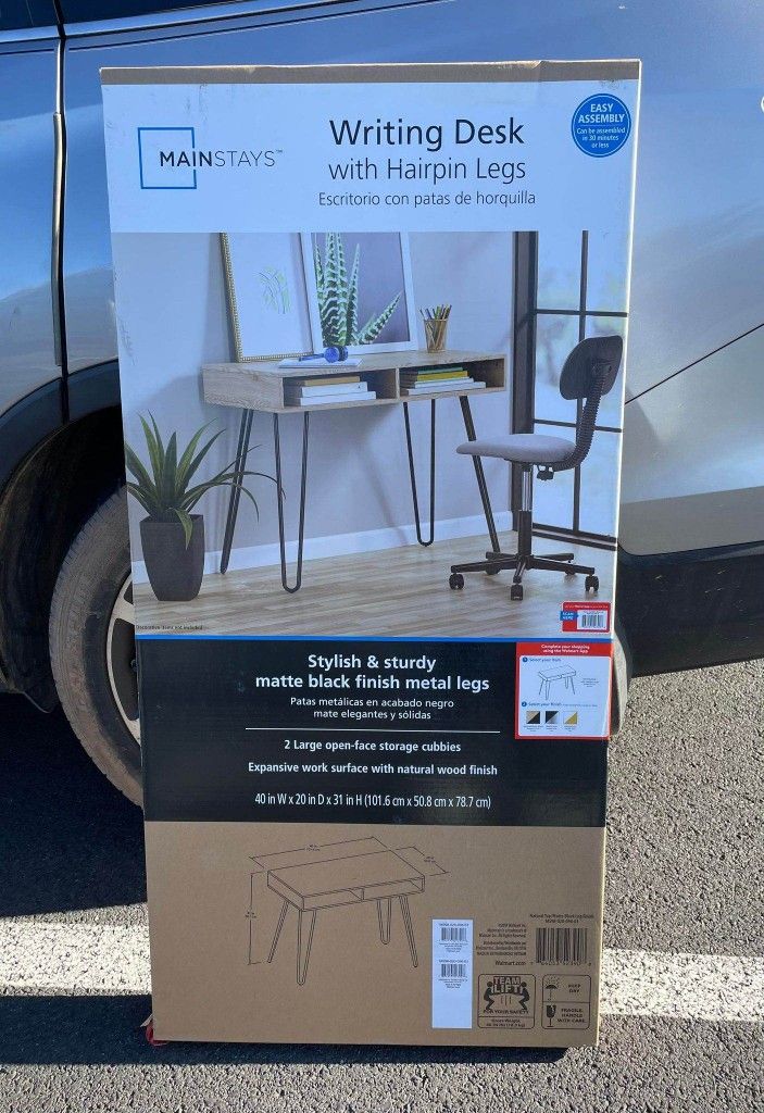 New/ assembly required • Durable laminate construction • Sturdy metal leg design • 2 open cubbies for storing accessories and supplies out of sight • Large open work surface for working on projects, homework, and other home office tasks • Metal hairpin-style legs for a fun retro industrial feel • Ideal for use in a home office, or dorm room • Assembly required • 3D interactive assembly guide available through the free BILT app (Download from the app store or Google Play) • Dimensions: 40 in W x 20 in D x 31 in H (101.6 cm x 50.8 cm x 78.7 cm)