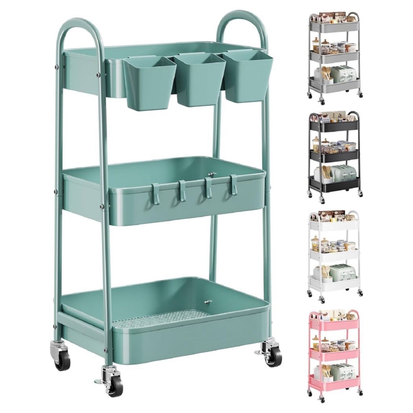 Brand new come with Box 3 Tier Green Metal Rolling Cart with Lockable Wheels and Handle, 3 Tiered Utility Storage Organizer Carts for Teachers, Arts, Craft, Snack, Book, Bedside, Nursery, Cleaning Supplies, Easy Assembly