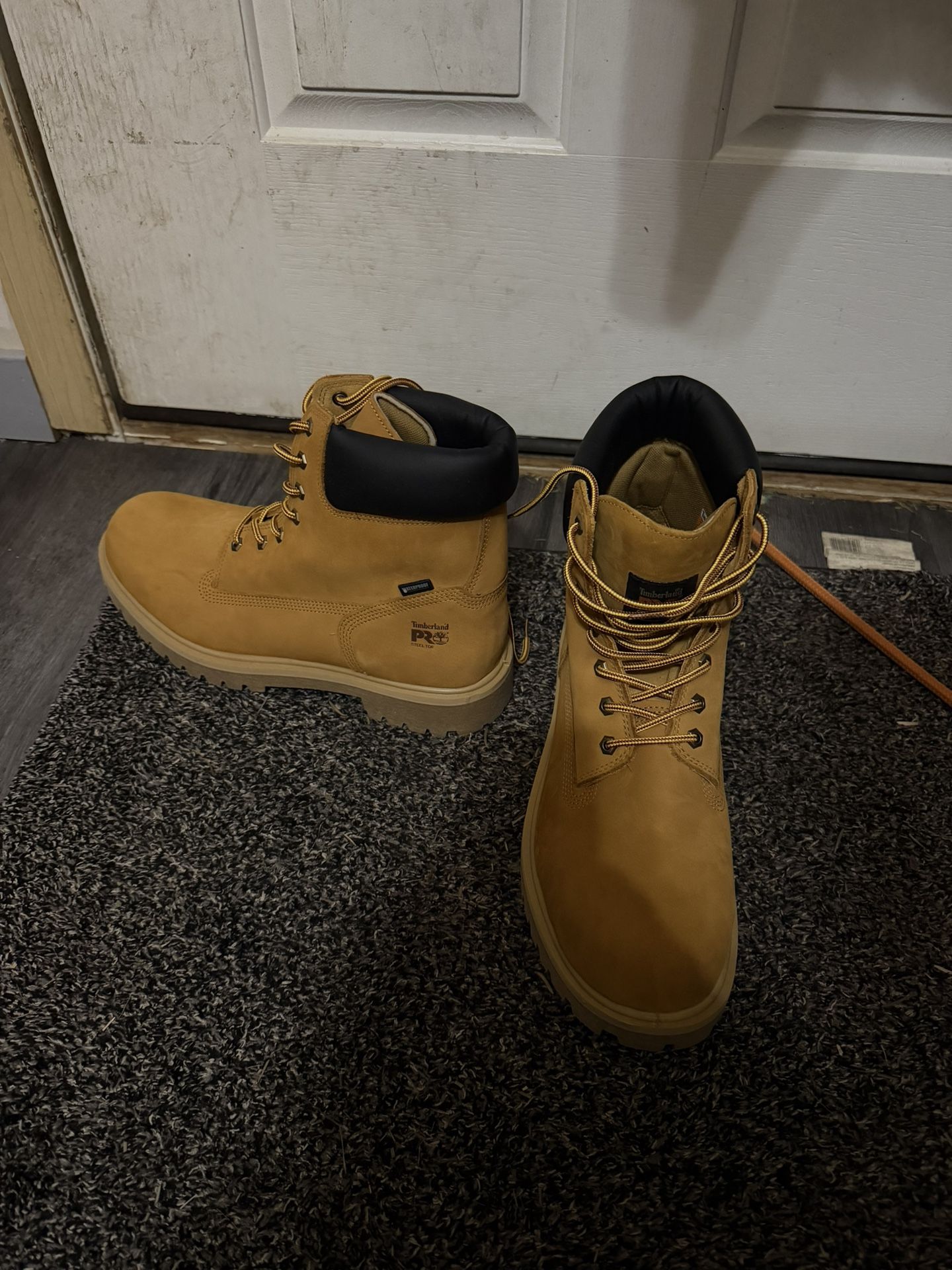 These size 14 Timberland boots have been tried on but never worn. The Timberland legacy is present in this tougher-than-ever boot. The brand took its classic 6-inch style and bulked it up with maximum protective features to create the Timberland Pro 6" Direct Attach Leather ST WP. This steel-toe boot is insulated and seam-sealed to keep feet dry and toasty. The waterproof leather upper paired with an oil-resistant, nonmarking rubber lug outsole ensures long-lasting footwear. Features of Men's Timberland PRO 6" Direct Attach Leather Steel Toe Waterproof Boots Weight: 4 lb 6 oz Height: 6 inches 200g insulation Steel toe protection Upper made of waterproof leather Seam-sealed direct-attach construction Padded collar provides comfort and protection from debris Anti-microbial lining Anti-microbial footbed cover Contoured shock-diffusion plate Durable rubber lug outsole Meets ANSI Z41PT99, ASTM F2412-11, ASTM 2413-11 and F2892-11 protection standards