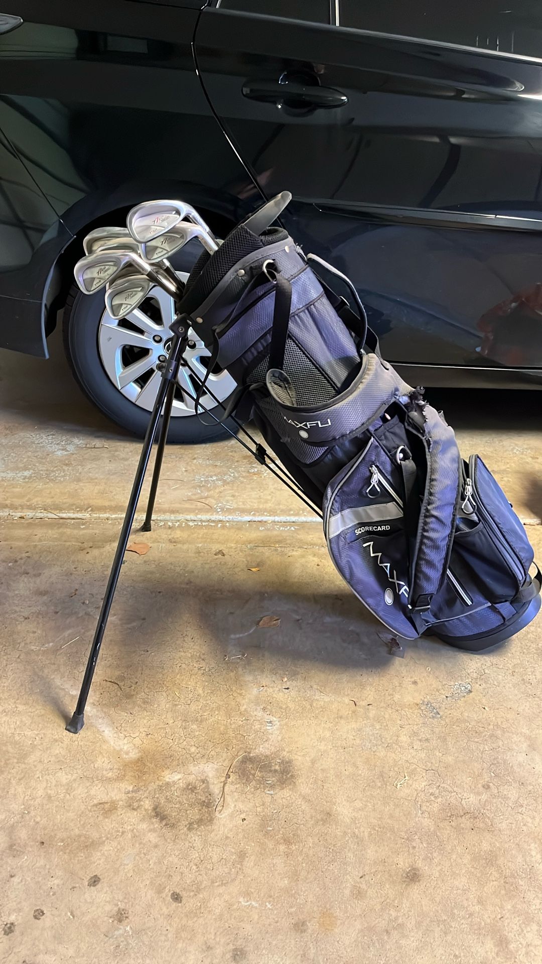 Cool golf clubs with a working awesome bag it can be a back pack or stand in its legs.