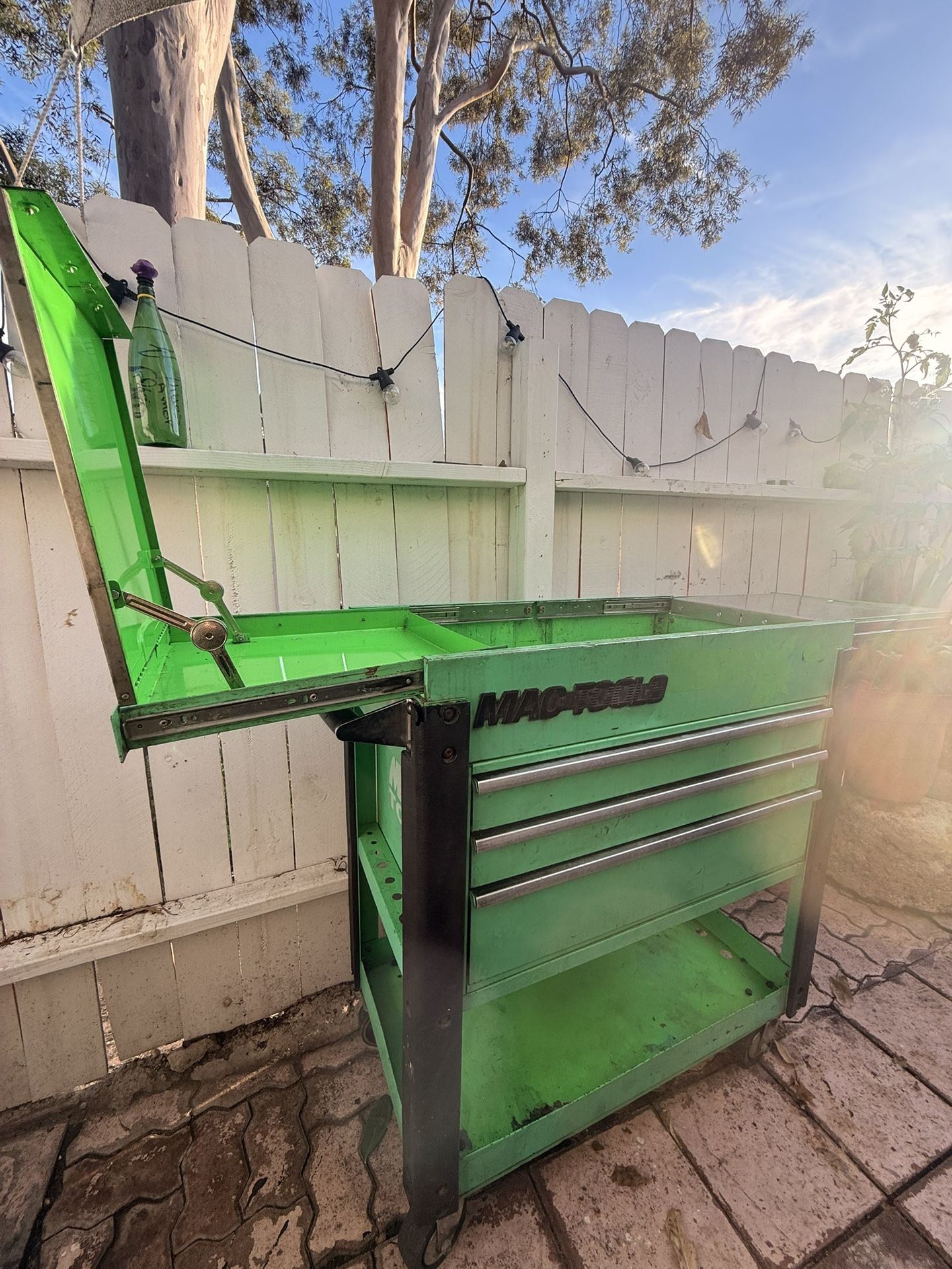 Vintage Green Mac tool toolbox just upgraded to a new one so don’t need this one anymore. Definitely has some wear on it but still a good tool box just needs a lil love, rails could get greased up and it’s missing one wheel I just had a piece of wood under it cause I never moved it. wanted to restore it but just don’t have the space for it anymore. will also throw in a Husky liner