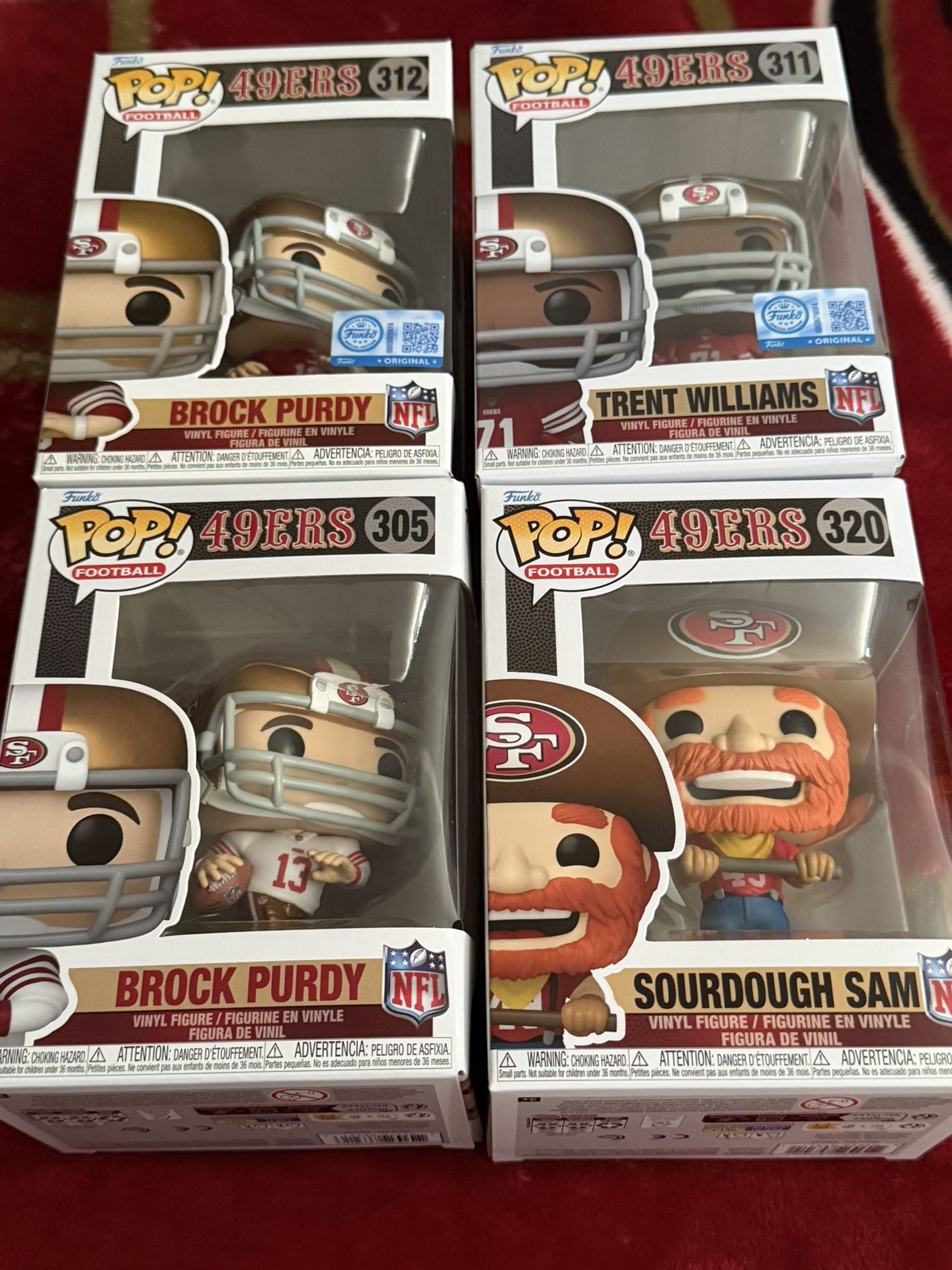 All 4 BRAND NEW & UNOPENED FUNKO POP EXCLUSIVE BROCK PURDY #312 FUNKO POP BROCK PURDY #305 FUNKO POP EXCLUSIVE TRENT WILLIAMS #311 FUNKO POP SOURDOUGH SAM # 320 PICK UP ONLY / NO SHIPPING FINAL SALES