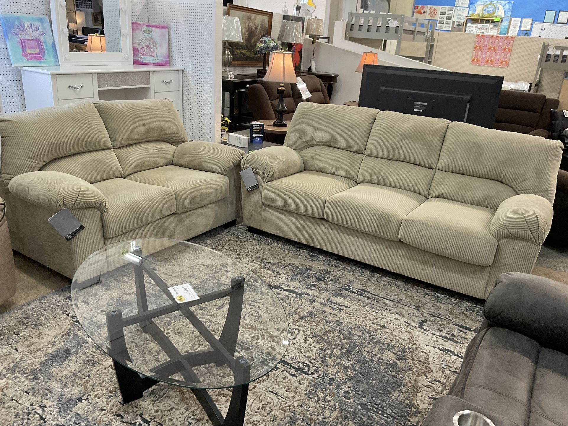 Ashley Living Room Set π² $899.99 + tax (cash price) π¨ Color: Beige corduroy Comfortable Ashley sofa and loveseat set with soft corduroy fabric. Very cozy and perfect for living room or family room. βοΈ Includes sofa + loveseat βοΈ Ashley Furniture βοΈ Super soft corduroy fabric βοΈ Thick cushions βοΈ Wide arms βοΈ Modern casual style βοΈ Very comfortable seating π Dimensions: Sofa: 83β W Γ 38β D Γ 40β H Loveseat: 63β W Γ 38β D Γ 40β H π Delivery available β ask for details π³ Financing available π¬ Paty Furniture β Burien Open MonβSat 10-7 Sun 10-4 Message for availability. sofa set β’ couch set β’ ashley sofa β’ living room set β’ loveseat β’ couch β’ furniture β’ sofa loveseat β’ beige sofa