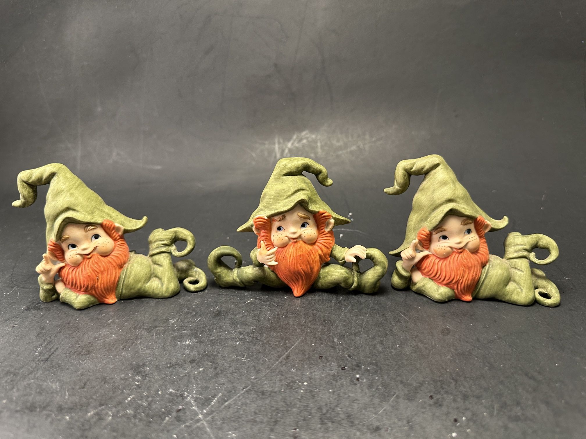 Vintage Lefton Set of 3 Leprechauns, Lefton Gnomes, Green Elf Pixie