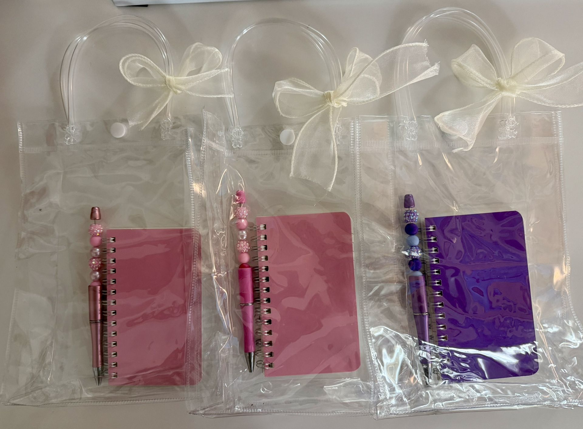 Handmade bling pens, come with a matching spiral notebook inside a clear gift bag.