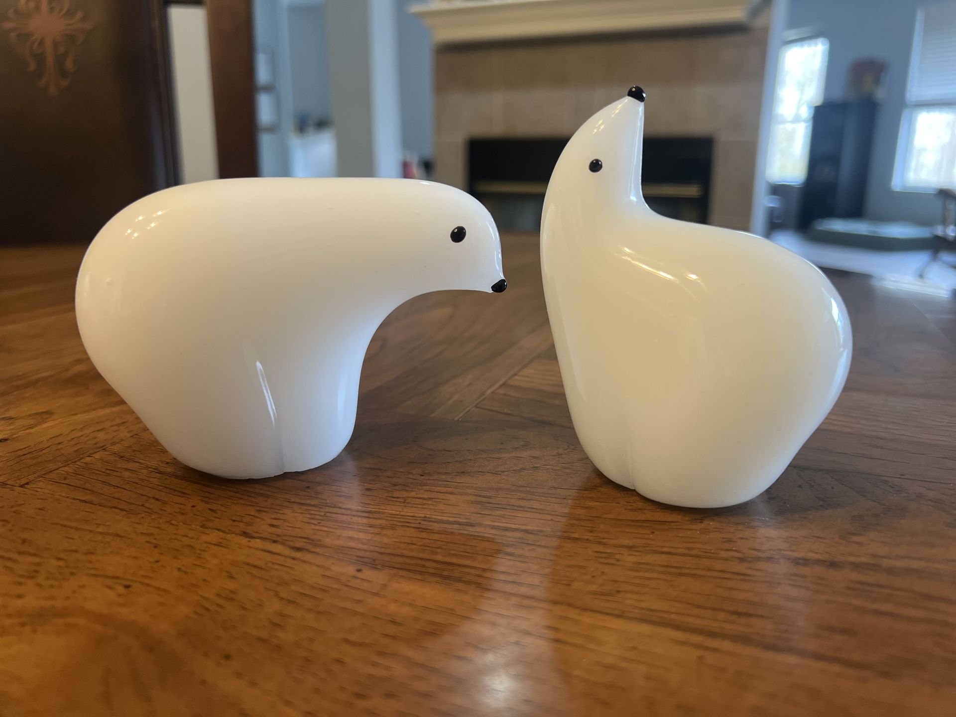 These adorable polar bear sculptures come as a pair and are made of solid white glass in minimalist Scandinavian art style. They measure 3” x 5” and 4” x 3.5”. These are in great shape - no cracks or chips, but one has a few rough spots at base.