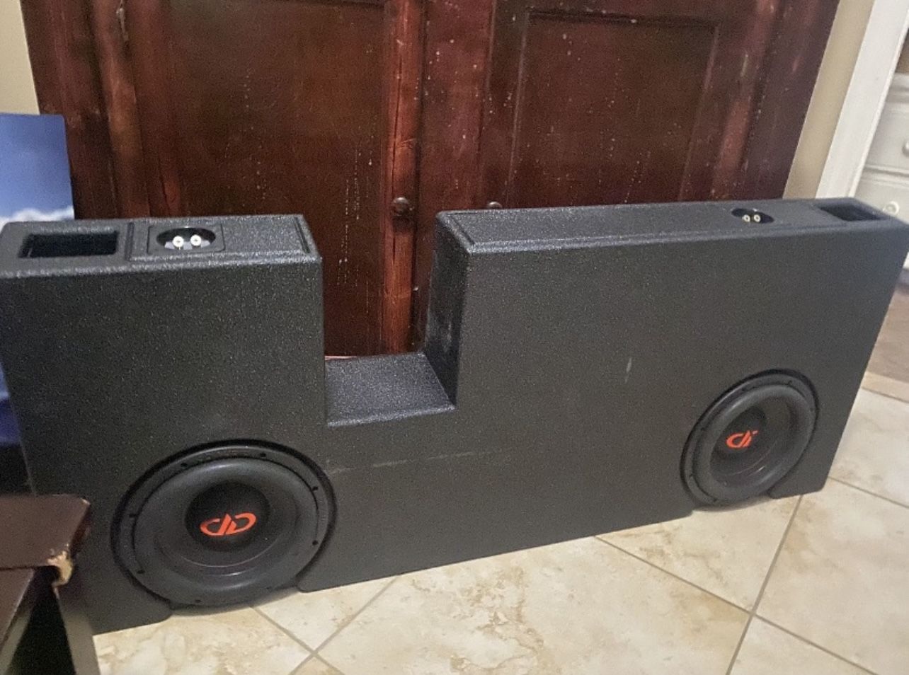 2 10 inch DD subwoofers with box and a 3000 watt WDX amp. Work perfect and hit really hard for 10s.