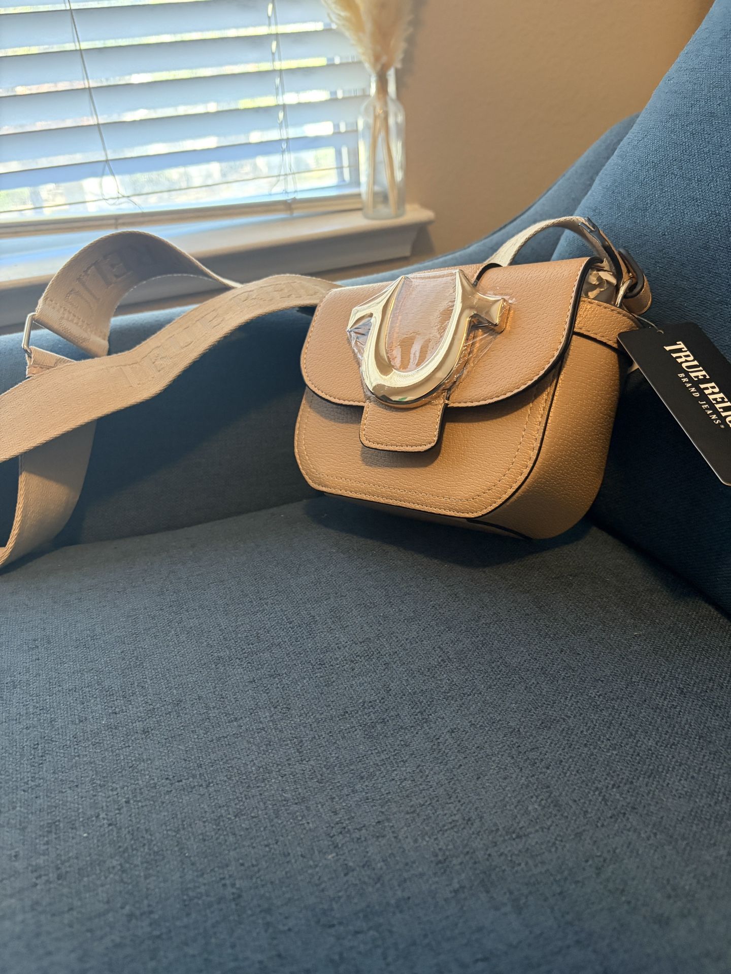 True Religion Small Tan Faux Leather Flap Crossbody Bag Gold Hardware New W Tags