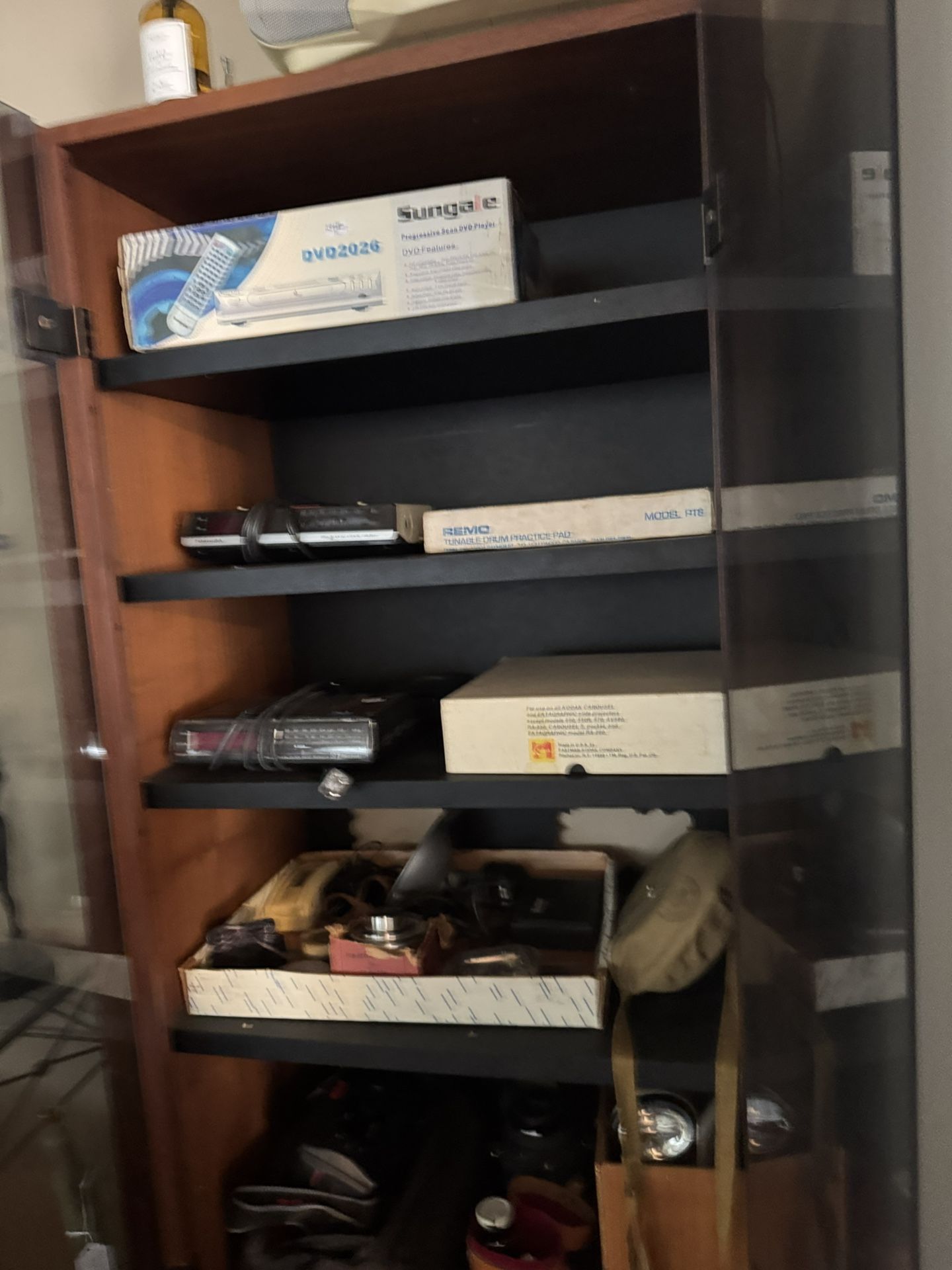 Cabinet for stereo set. Entertainment center. With multiple shelves.