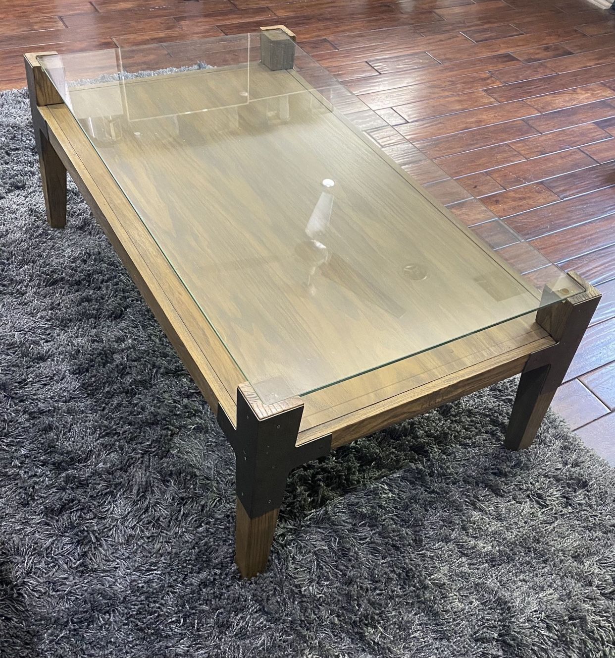 46"L x 26"W x 18"H Glass, wood, steel coffee table, 2 levels, in great condition.