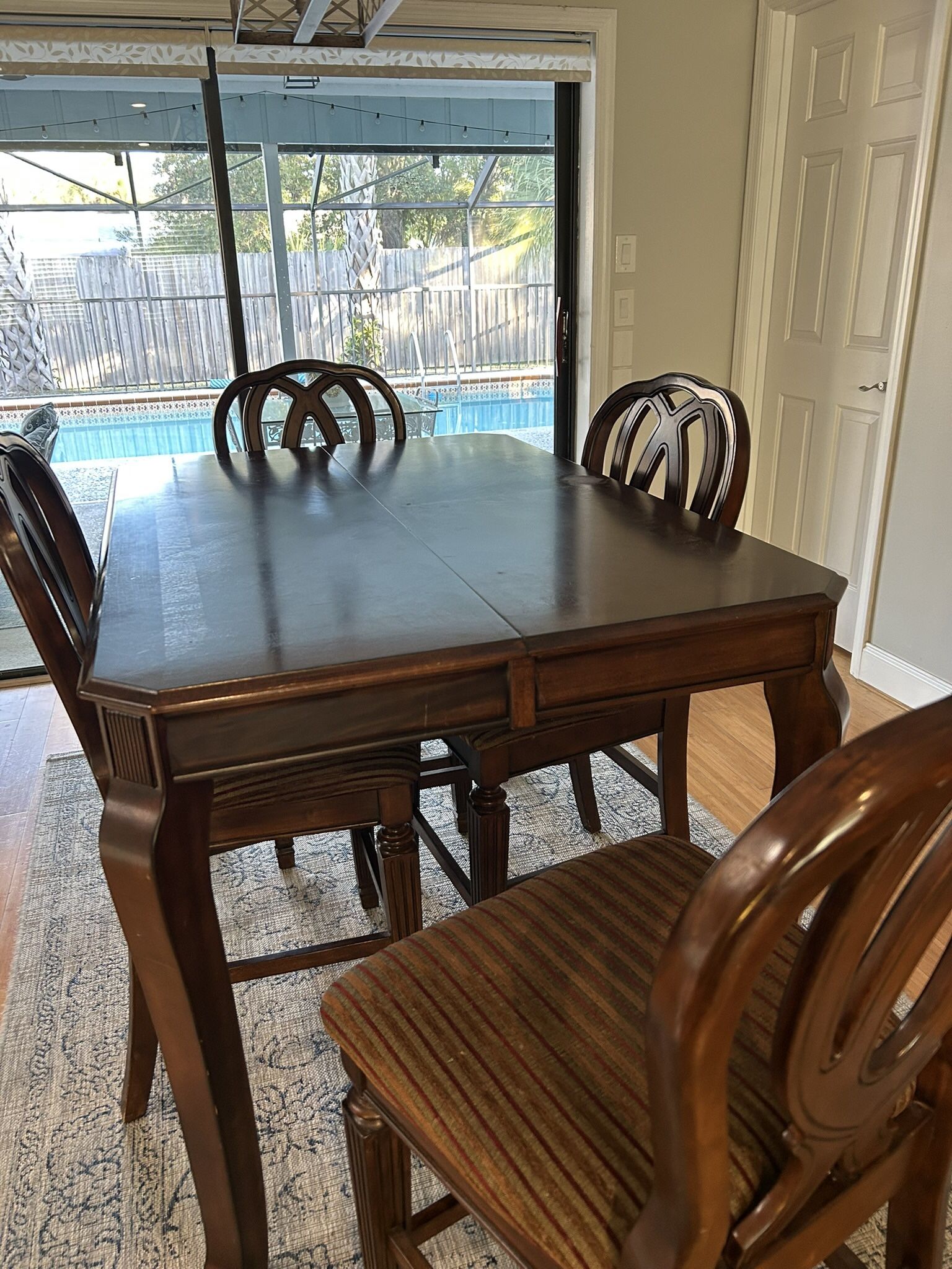 Beautiful 36” x 54” table and six (6) chairs Counter height with 18” leaf, making table 54” x 54” Spot on table. Seat cushions. Could be updated with newer fabric