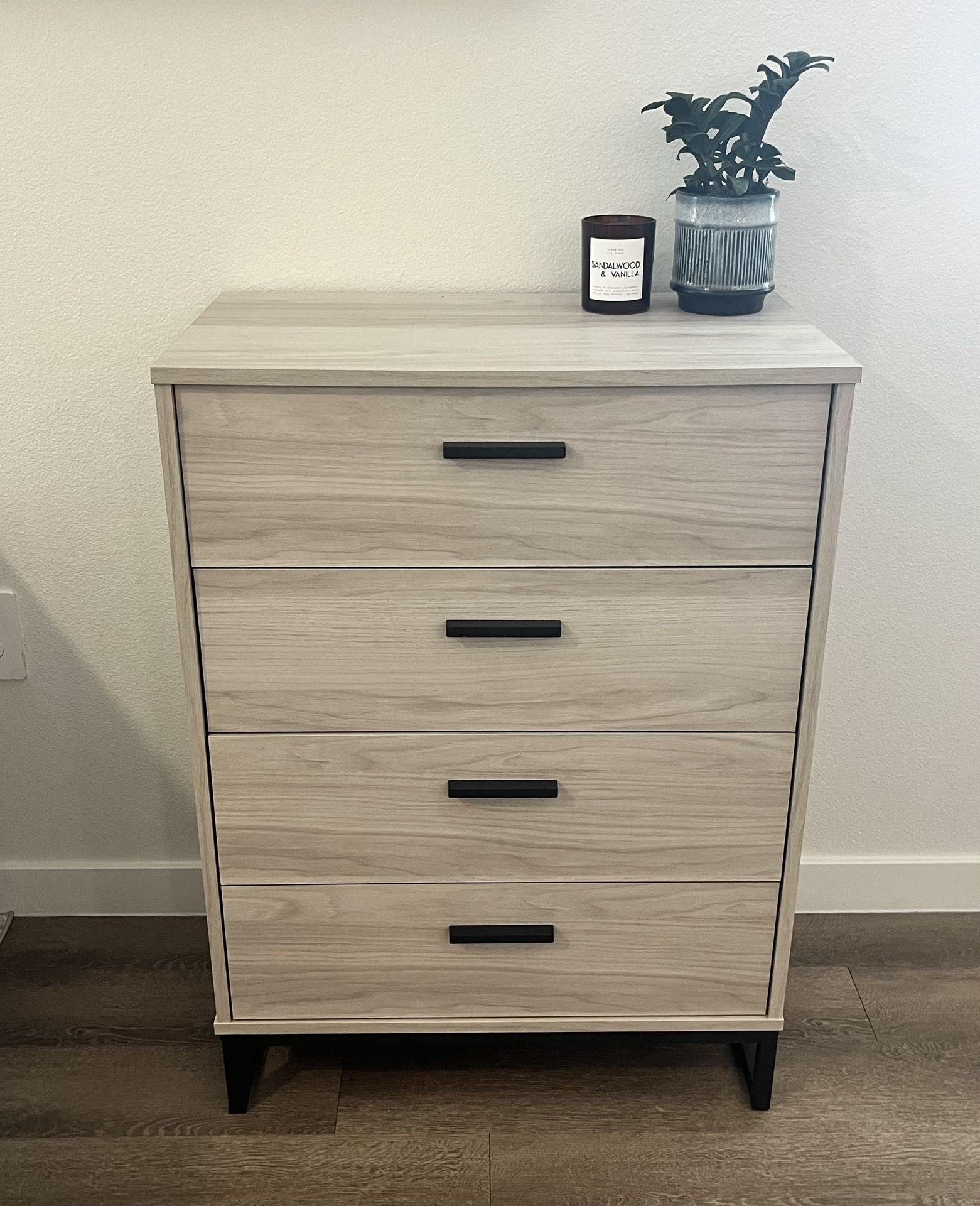 Ashley Furniture Socalle 4-drawer chest Modern design with a light natural wood finish 4 smooth-gliding drawers Durable engineered wood with oak grain finish Sleek modern style with metal handles Like new condition - one very small mark on top from assembly. Used for staging. Dimensions: Approx. 27” W x 36” H x 16” D Serious inquiries only please. No trades. Pickup near 51/Cactus Rd.