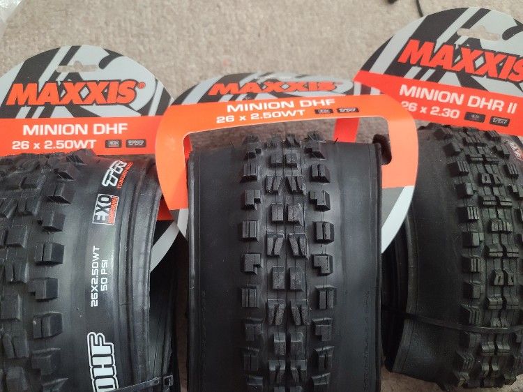 BRAND NEW,NEVER USED OR MOUNTED I have 3 Tires in total,as follows.. 2 FRONT TIRES.. Two (2) Maxxis Minion DHF 26X2.5 WT@50PSI EXO Protection & Tubeless Ready 1 REAR TIRE.. One (1)Maxxis Minion DHR 11 26X2.3 60PSI EXO Protection & Tubeless Ready They are @$80 for Each one.. OR ** Deal if you buy all 3 at once! @$200 if you BUY all 3 at once! ** Please contact 1st if you want all 3! No Exceptions ,NONE Also Stop asking "if its available" if you see this add it's for sale! Thanks for Reading