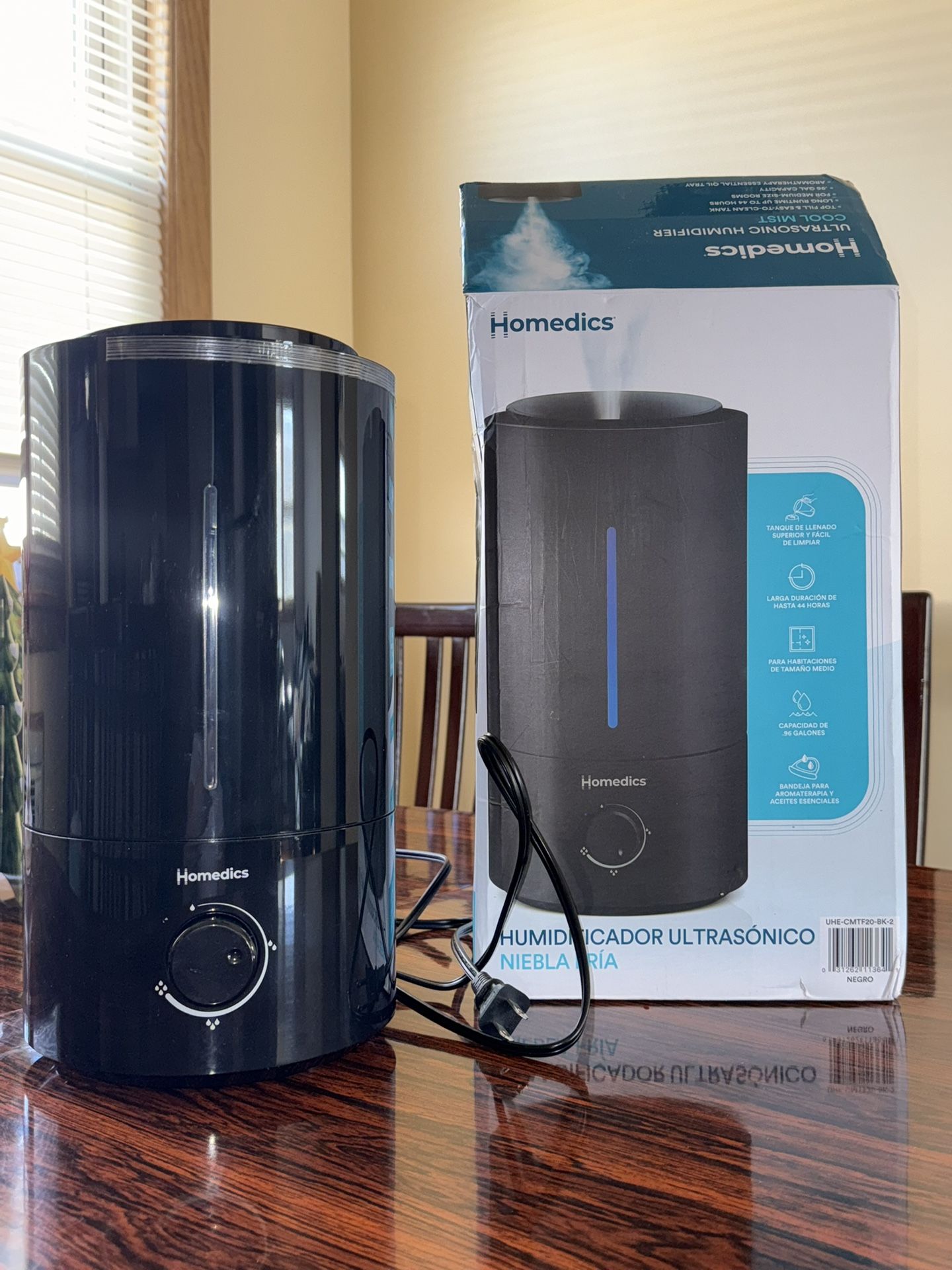 The Ultrasonic Humidifier HoMedics is designed for use in bedrooms and offices. It features a sleek black plastic design and utilizes ultrasonic humidification method for efficient and quiet operation. This portable humidifier is easy to use and maintain, perfect for whole-room humidification.