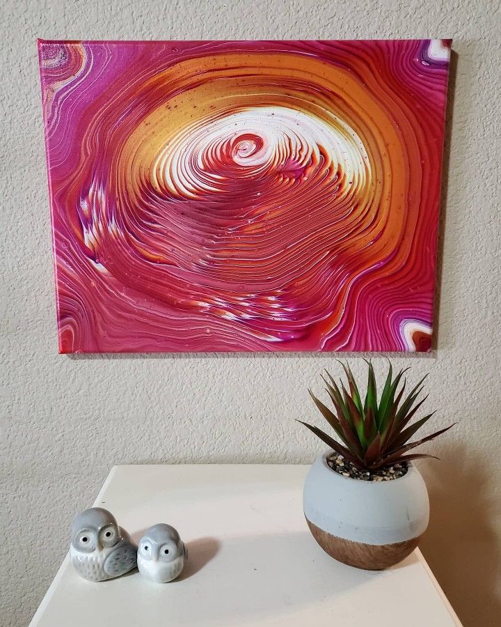 One of a kind, hand painted, abstract artwork. Measures 14" x 18" on an artist's grade level 2 stretched canvas. Beautiful sunset colors. Piece is titled "Island in the Sun" View more available pieces at https://offerup.co/faYXKzQFnY?$deeplink_path=/redirect/