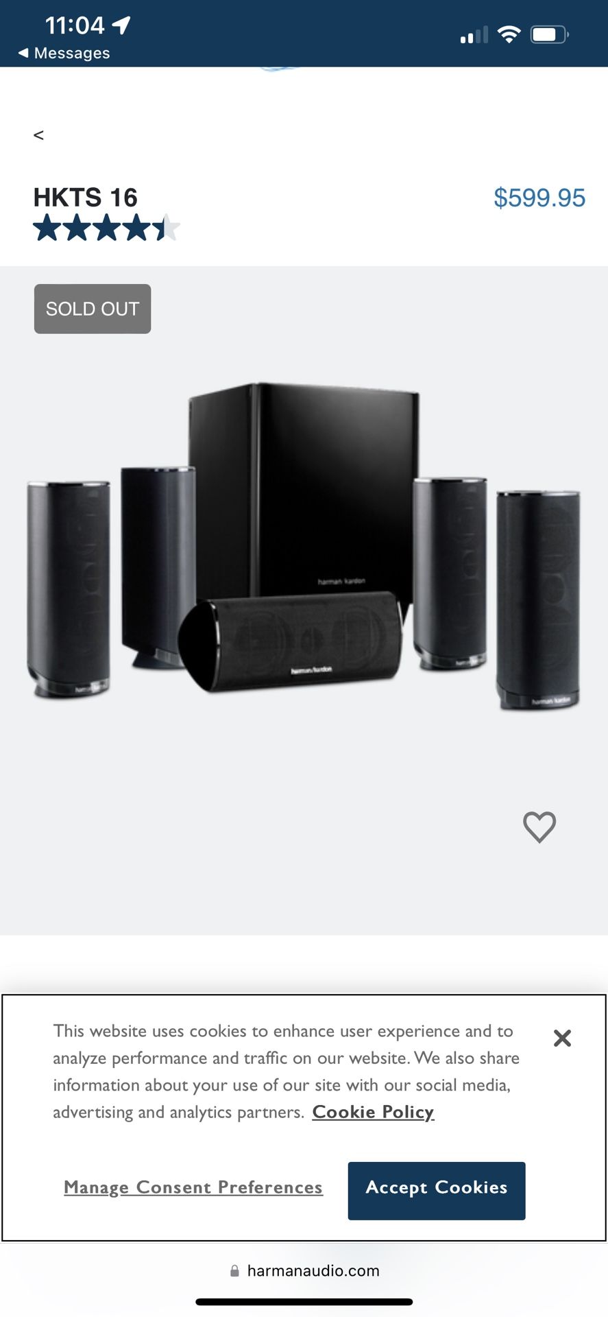 5.1 Harmon Kardon HKTS 16 sound system $600 new Speakers all in great condition, comes with two speaker stands 200W Subwoofer need repair