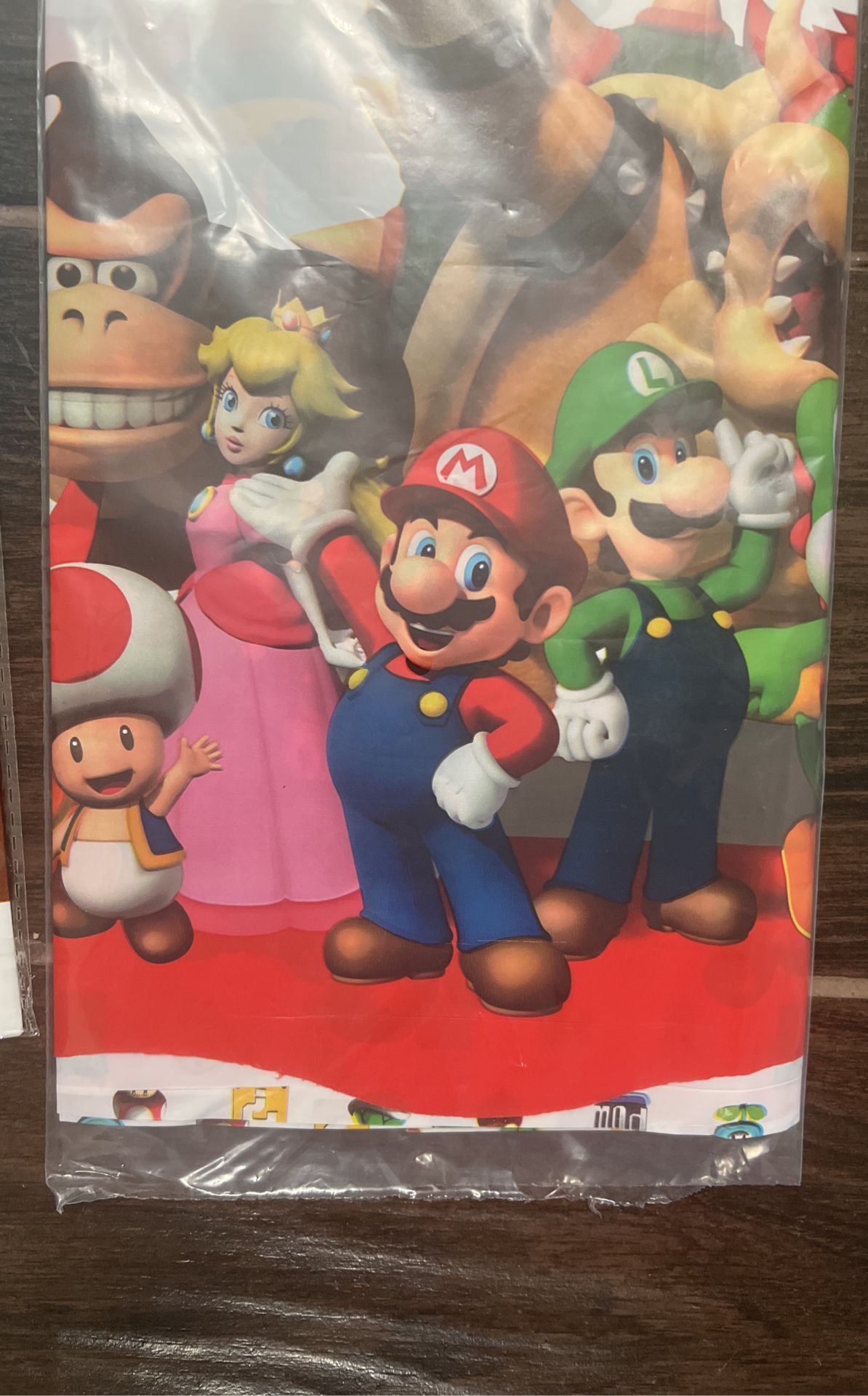Super Mario Birthday decorations- masks, table covers, decorative fans, etc