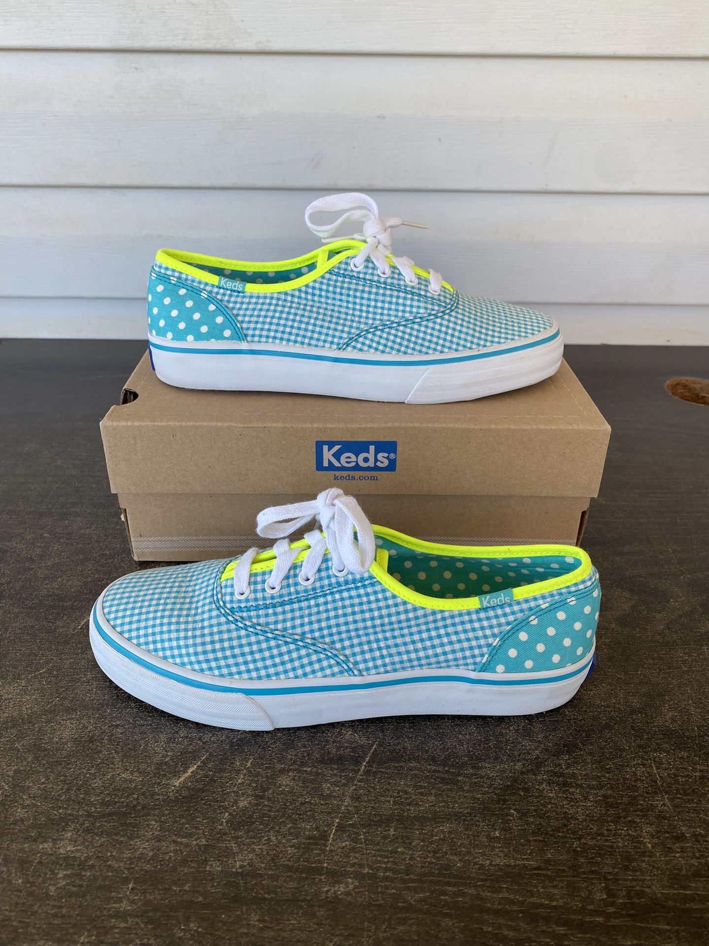 Keds Original Sneakers Lace Up Blue/Aqua Gingham/Polka Dot Shoes Womens Sz 7