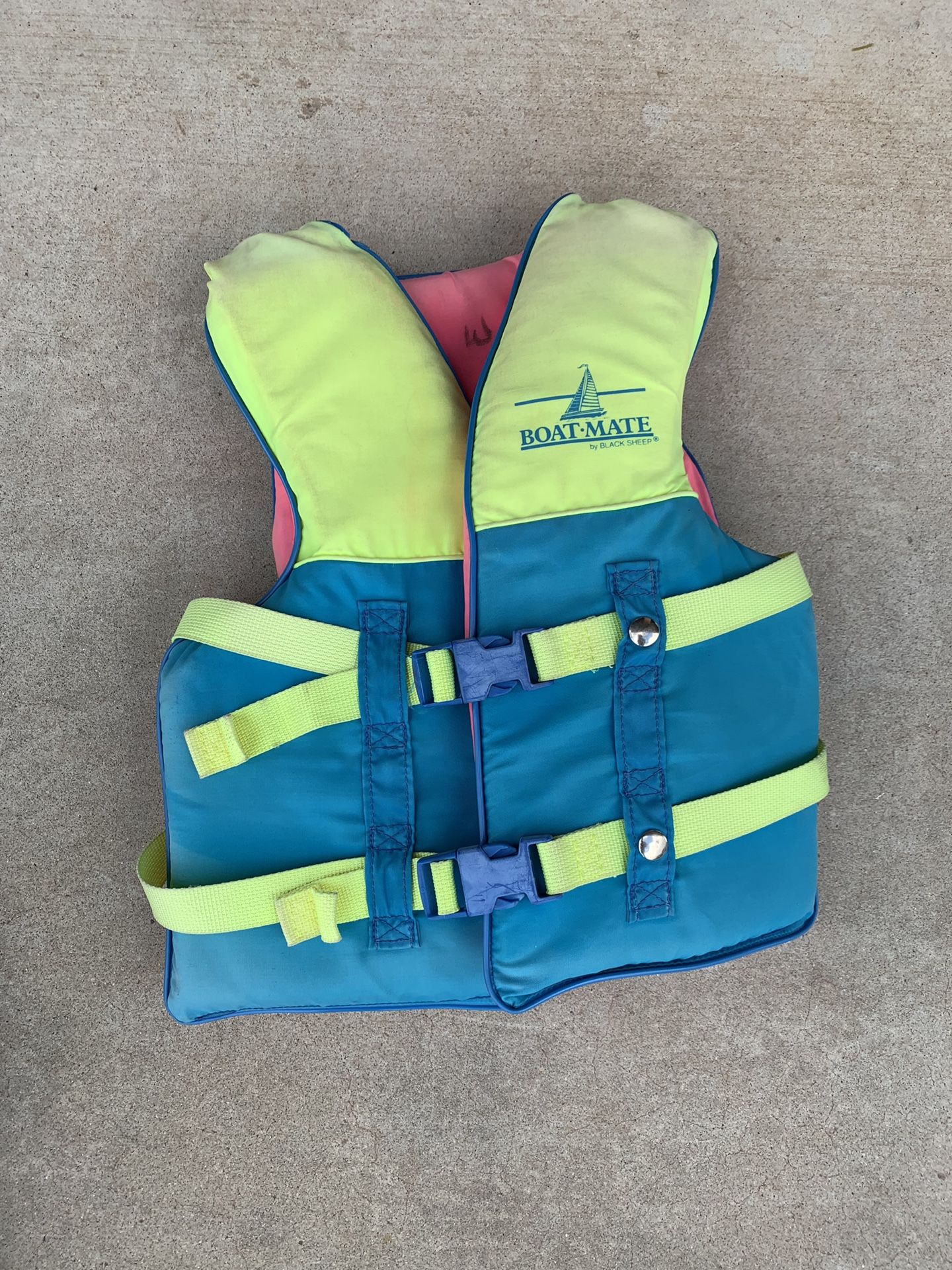 Life vest/ jacket is for children 50-90lbs. It’s vintage and bright color look allows it to easily be seen while in the lake. Willing to negotiate on price. Especially if there is interest in other items listed.