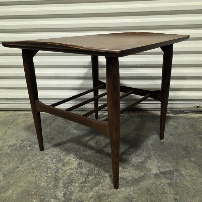 Vintage Bassett side table . Very solid, good candidate for refinishing From Bassett's Artisan Collection, this beautiful side table or lamp table in gorgeously grained walnut. This collection is clearly influenced by Danish designer Grete Jalk's iconic surfboard tables. Sculptural curved lip on the sides, spindled magazine rack below. 25" x 24" x 21.875" high