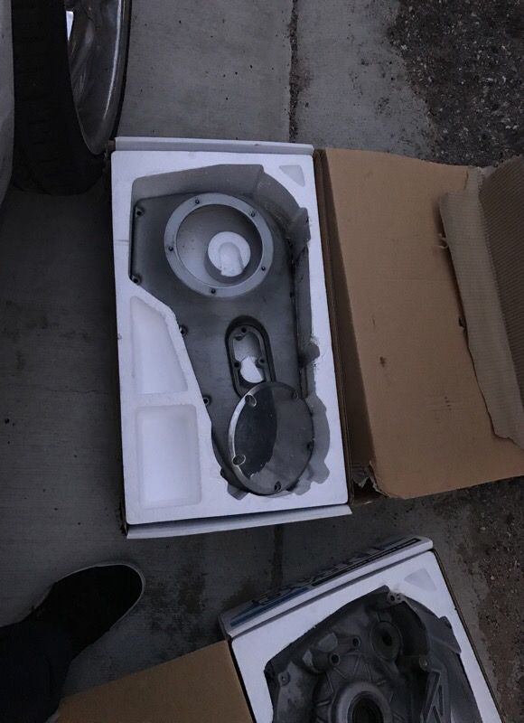 Stock inner and outer primary covers. Come with derby covers. No screws available. There in good shape all they need is a sand down and buff to bring out shine!