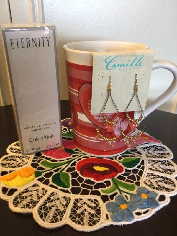 Romantic. Timeless. Feminine. ETERNITY was inspired by the ideal of lasting love and intimacy. This classic scent is a harmonious blend of white flowers and creamy woods. Top Notes: freesia, mandarin, sage Middle Notes: muguet, white lily, marigold, narcissus Base Notes: sandalwood, patchouli, amber Find Your Perfect Scent! πΈ Was $64 when purchased selling for $ 40 Never opened , size 1.7 FL OZ 50 ml spray bottle. Selling the long fashion earring with the perfume together. Earring price is $15 Price is set for all together $55
